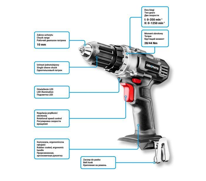 Wiertarko-Wkrętarka Graphite Energy+ 10 mm 18V 2Ah 58G000-SET1 to wydajne i nowoczesne narzędzie akumulatorowe przeznaczone do intensywnych prac domowych i profesjonalnych. Zasilana mocnym akumulatorem 18V o pojemności 2Ah, zapewnia dużą siłę wiercenia i wkręcania oraz długi czas pracy bez ładowania. Kompaktowa konstrukcja i ergonomiczny uchwyt umożliwiają komfortowe manewrowanie, nawet w trudno dostępnych miejscach. Uchwyt 10 mm pozwala na szybkie i łatwe mocowanie osprzętu. Model z serii Energy+ jest kompatybilny z innymi urządzeniami tego systemu, co czyni go praktycznym wyborem dla każdego majsterkowicza.