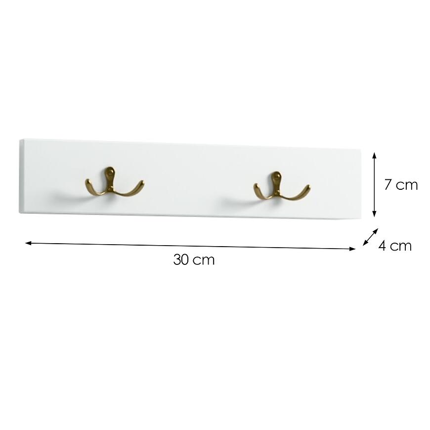 Wymiary: szerokość 30 cm, wysokość 7 cm i głębokość 4 cm pozwalają wygodnie powiesić odzież, torby czy akcesoria w przedpokoju, sypialni lub biurze. Niewielka waga 1 kg ułatwia montaż i ewentualne przemieszczanie wieszaka.