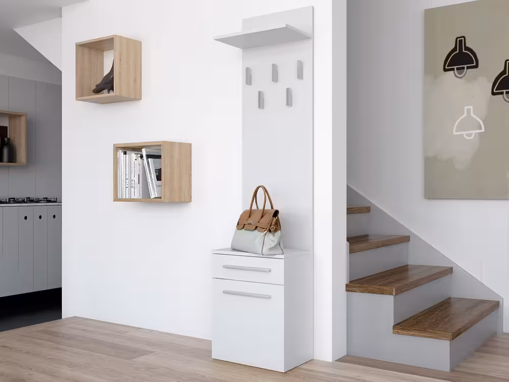 Mebel składa się z dwóch części: kompaktowej szafki oraz wieszaka z półką. Szafka o wymiarach 35 cm głębokości, 50 cm szerokości i 57 cm wysokości stanowi praktyczne miejsce do przechowywania butów, toreb lub dodatków. Wyposażona jest w pojemną szufladę oraz mniejszą szafkę, co ułatwia organizację drobiazgów i akcesoriów. Wieszak z półką ma wymiary 27 cm głębokości, 50 cm szerokości i 124 cm wysokości, dzięki czemu idealnie komponuje się z szafką, tworząc spójną i estetyczną całość.