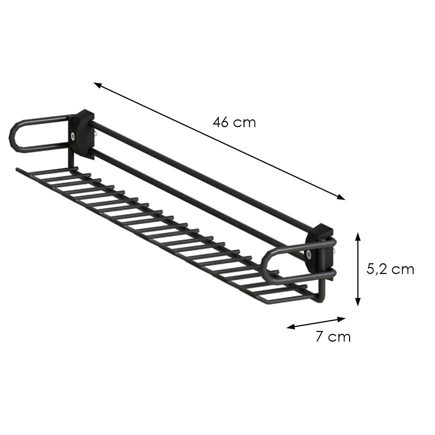 Produkt ma wysokość 5,2 cm, szerokość 46 cm i głębokość 7 cm, co pozwala na wygodne umieszczenie go w szafie lub na drążku garderobianym. Lekka konstrukcja (waga 1,3 kg) ułatwia montaż, przenoszenie i ustawienie w odpowiednim miejscu, a solidny metal gwarantuje stabilność podczas użytkowania.