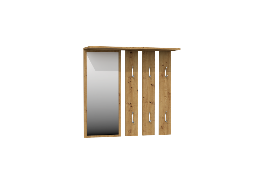 Wieszak Opi to elegancki i funkcjonalny mebel, który łączy w sobie dużą powierzchnię lustra, praktyczne półki oraz 6 wieszaków na ubrania. Dostępny w kolorze dąb artisan, wieszak doskonale wpisuje się w nowoczesne i klasyczne aranżacje przedpokoju, zapewniając wygodną organizację przestrzeni i estetyczny wygląd wnętrza.