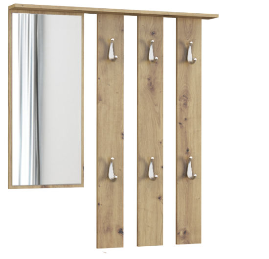 Wieszak Orion to bardzo praktyczny i funkcjonalny mebel. Nowoczesny moduł wiszący to funkcjonalny panel z sześcioma praktycznymi wieszakami oraz lustrem, pozwalającym skontrolować swój wygląd przed wyjściem z domu. Wymiary wieszaka: 112x99 cm. Wieszak Orion wykonany został z płyty laminowanej o grubości 16 mm co zapewnia jego wytrzymałość oraz solidność. Wieszak w kolorze dąb aristan.