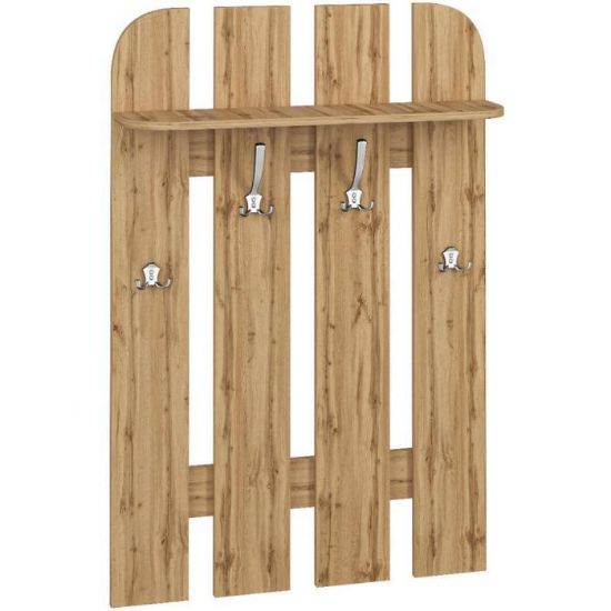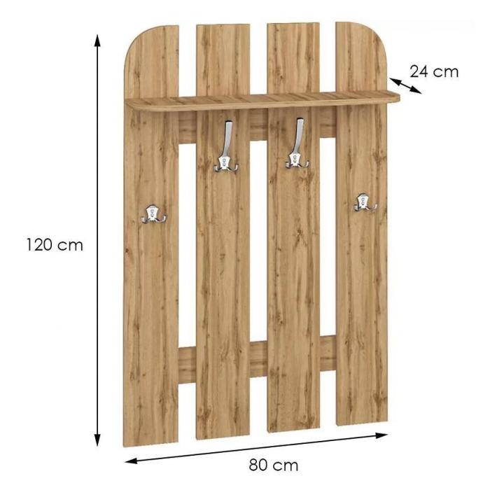 Wieszak Orlando idealnie wpasuje się w aranżacje, nadając przy tym nowoczesny i elegancki design. Jest to praktyczny mebel, który uporządkuje Twój przedpokój bądź inne, dowolne pomieszczenie. Dzięki swojej funkcjonalności, pomieści wiele ubrań czy innych drobiazgów, zajmując przy tym mało miejsca. Wieszak posiada haczyki oraz półkę w kolorze dąb wotan. Mebel do samodzielnego montażu.