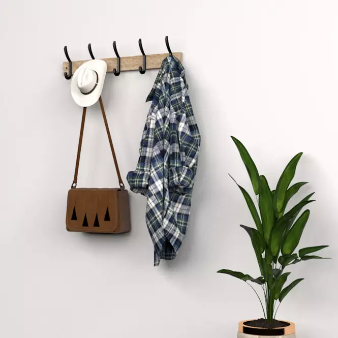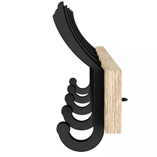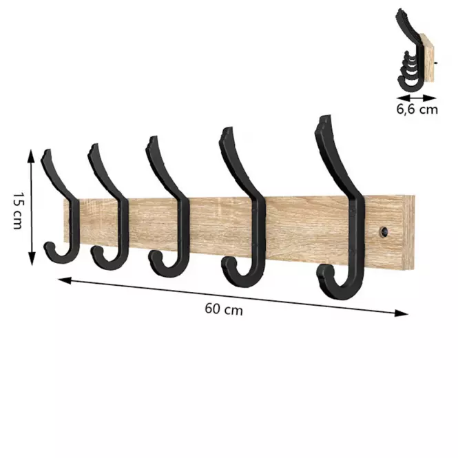 Dzięki szerokości 60 cm, wysokości 15 cm i głębokości 6,6 cm wieszak zapewnia wygodną przestrzeń do powieszenia kurtek, płaszczy, torebek czy kluczy, nie zajmując przy tym dużo miejsca. Połączenie czarnych, haków z naturalną płytą wiórową nadaje wieszakowi wyjątkowego charakteru, dodając wnętrzu zarówno funkcjonalności, jak i elegancji. To doskonały wybór do wnętrz, w których liczy się styl, jakość oraz efektywne wykorzystanie przestrzeni.