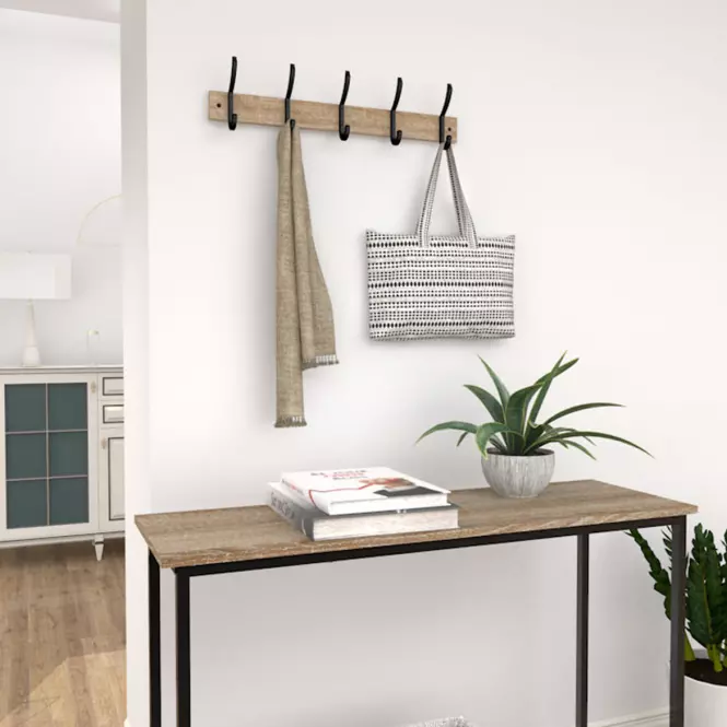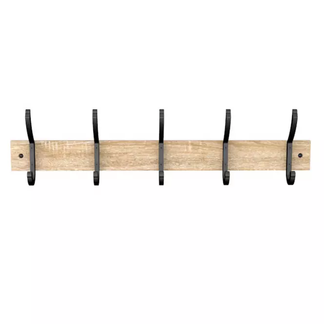 Wieszak ścienny 9332 w kolorze naturalnego drewna i czerni to kompaktowe i stylowe rozwiązanie, które idealnie sprawdzi się w przedpokoju czy biurze. Wykonany z trwałych materiałów – metalu i laminowanej płyty wiórowej – łączy funkcjonalność z estetyką, zachowując przy tym klasyczny styl. Jego matowe wykończenie dodaje elegancji i dyskretnego uroku, który harmonijnie wpisuje się w różnorodne aranżacje wnętrz.