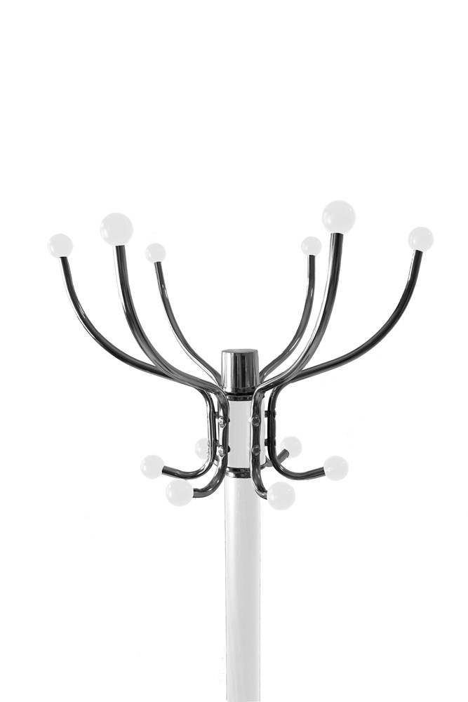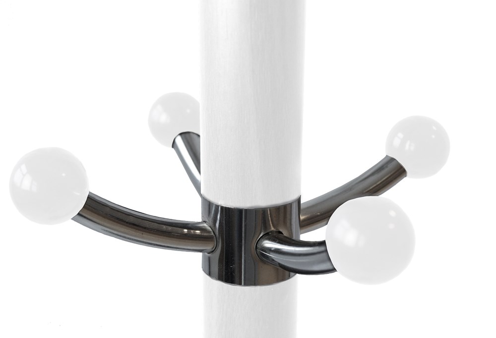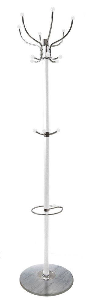 Wieszak stojący obrotowy idealnie wpasuje się w każdą aranżację. Posiada 12 obrotowych haczyków na górnej części wieszaka oraz 4 dodatkowe na ubrania dla dzieci. Metalowa zalaminowana konstrukcja zapewnia stabilność, a trzypoziomowe rozmieszczenie haczyków oraz uchwytu pozwoli na funkcjonalną organizację przestrzeni. Dodatkowo wieszak posiada uchwyt, który będzie kolejnym miejscem do przechowywania np. parasola. Dodatkowym atutem jest marmurowa podstawa o średnicy 37 cm.
