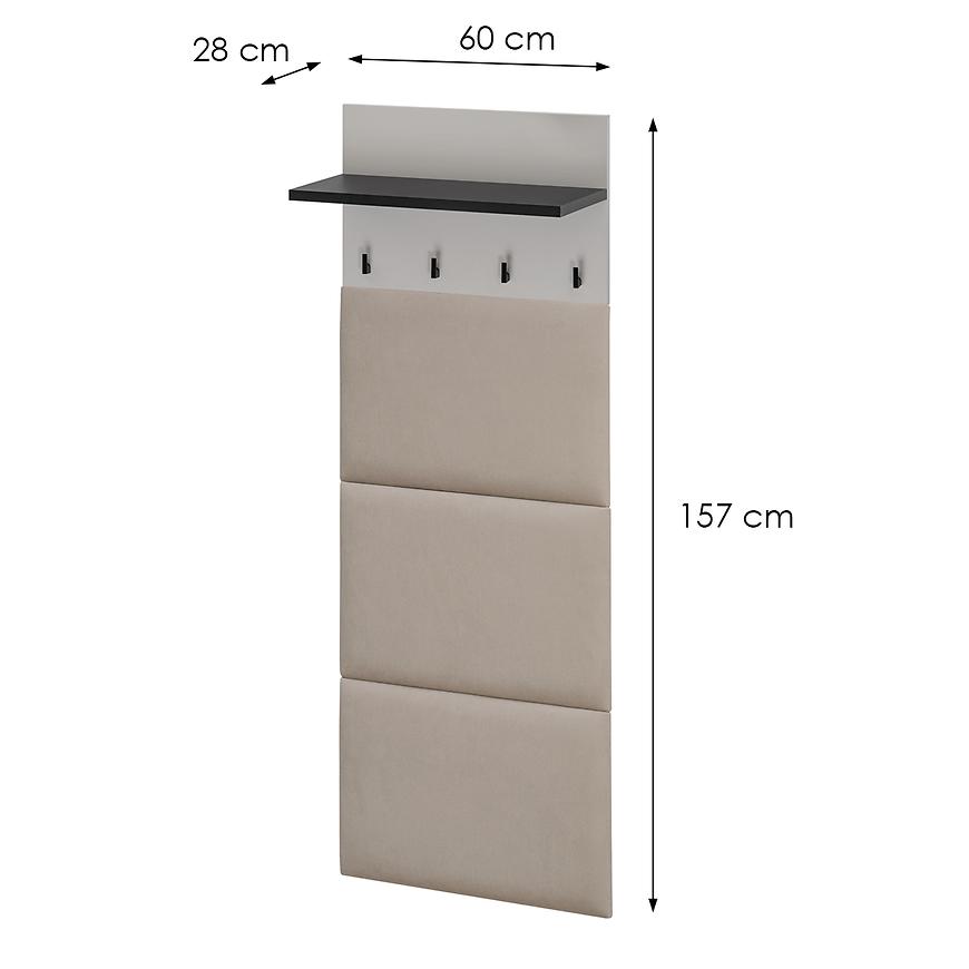 Wieszak Tapicerowany Hugo z kolekcji HUGO to praktyczne i stylowe rozwiązanie do przedpokoju, które łączy nowoczesną estetykę z wysoką funkcjonalnością. Wykonany z trwałej płyty wiórowej laminowanej, w eleganckim połączeniu kolorów kaszmir/czarny, doskonale wpisuje się w najnowsze trendy wnętrzarskie.