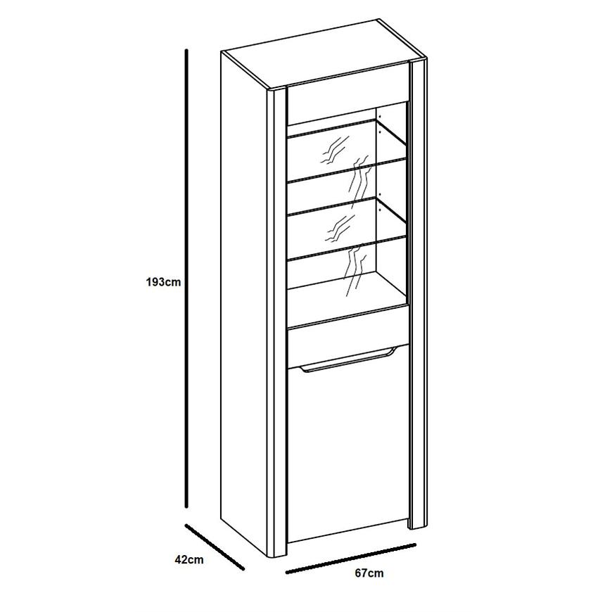 Klasyczna forma, jednodrzwiowa konstrukcja (z przeszkleniem, prawo lub lewo stronna w zależności od potrzeb klienta.) i funkcjonalny układ z czterema lub więcej półkami pozwalają na wygodne przechowywanie i eksponowanie dekoracji, książek czy zastawy. Zamiast tradycyjnych uchwytów zastosowano estetyczne wgłębienie, podkreślające nowoczesny design mebla.