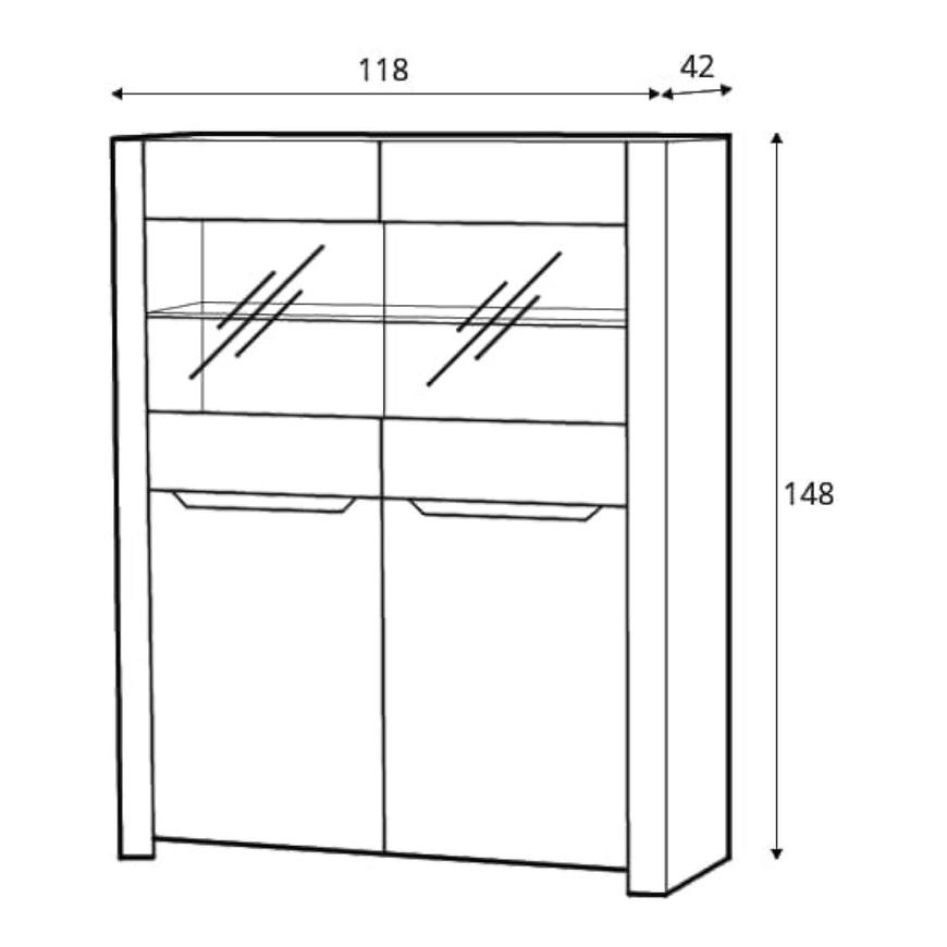 Klasyczna forma, dwudrzwiowa konstrukcja i funkcjonalny układ z czterema lub więcej półkami pozwalają na wygodne przechowywanie i eksponowanie dekoracji, książek czy zastawy. Zamiast tradycyjnych uchwytów zastosowano estetyczne wgłębienie, podkreślające nowoczesny design mebla.