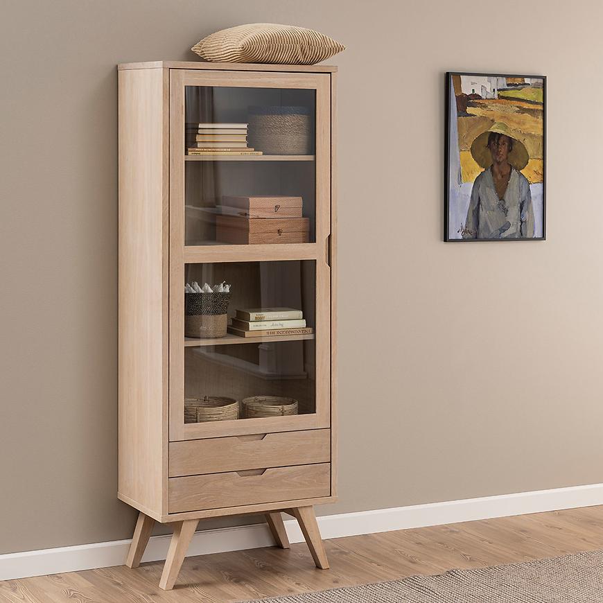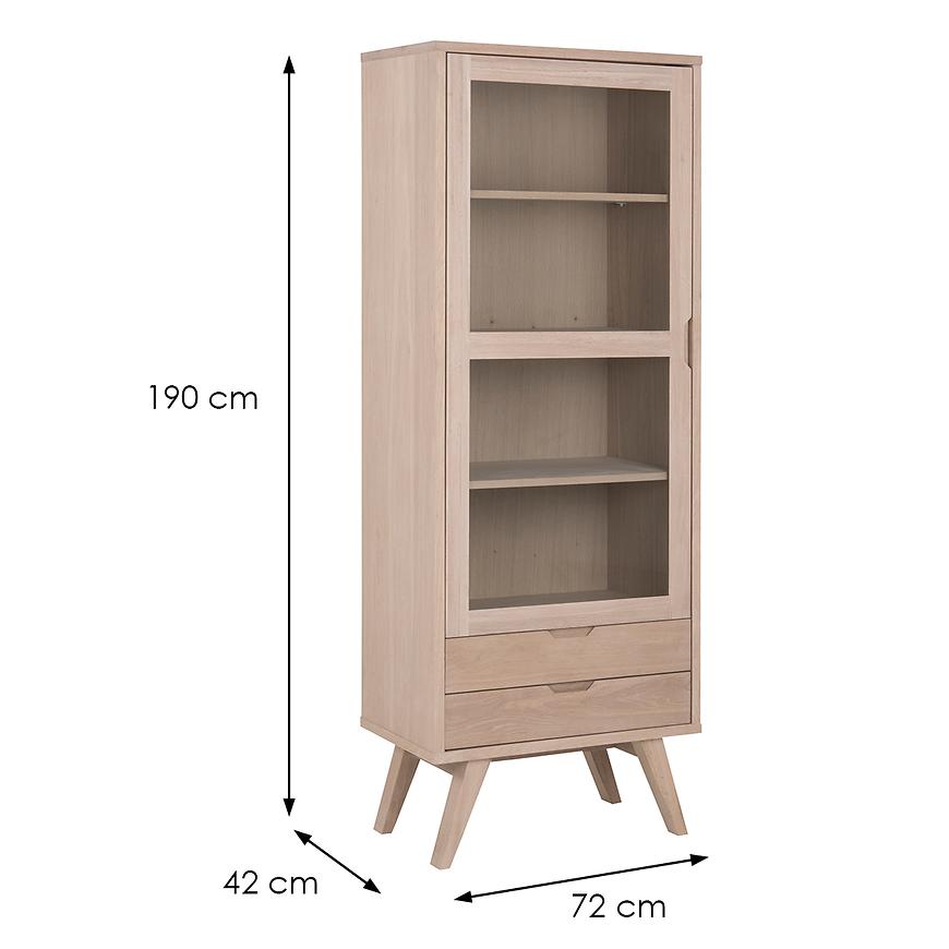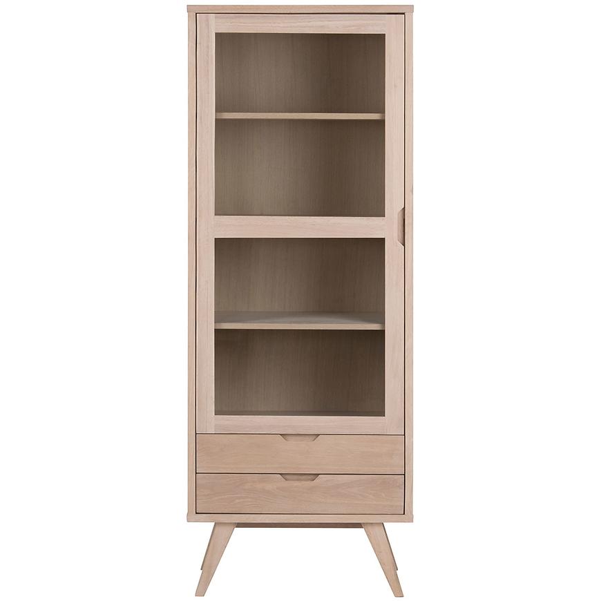 Wnętrze witryny zostało przemyślane pod kątem funkcjonalności. Znajdują się w niej 4 półki, które umożliwiają efektywne rozmieszczenie różnorodnych przedmiotów, dzięki czemu można utrzymać porządek w pomieszczeniu. Dodatkowo, 2 szuflady i jednodrzwiowy segment dodaje witrynie elegancji i ułatwia przechowywanie drobnych przedmiotów.