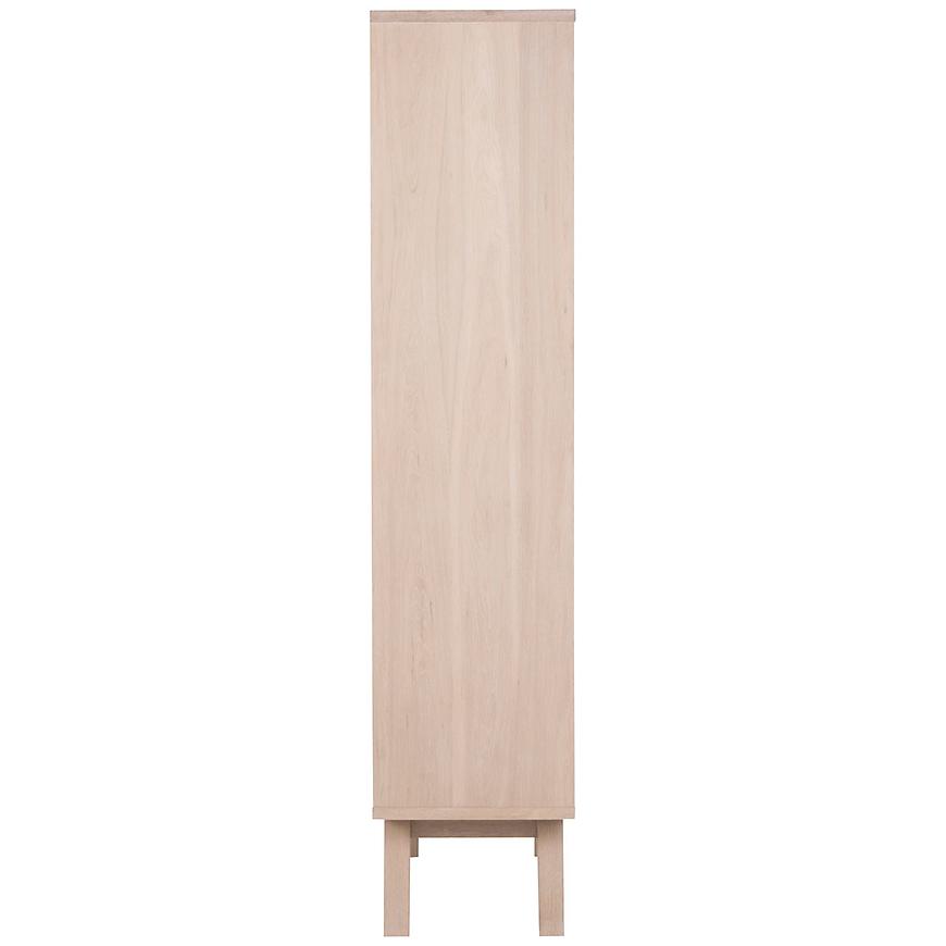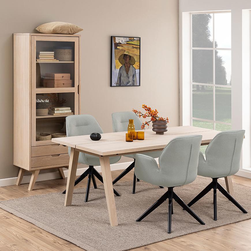 Biały dąb nadaje witrynie lekkości i nowoczesnego charakteru. Matowe wykończenie podkreśla jej wysoką jakość wykonania, dodając jednocześnie subtelności i delikatności. Konstrukcja frontów z płyty wiórowej laminowanej zapewnia trwałość i łatwość utrzymania w czystości, gwarantując długotrwałą satysfakcję z użytkowania.