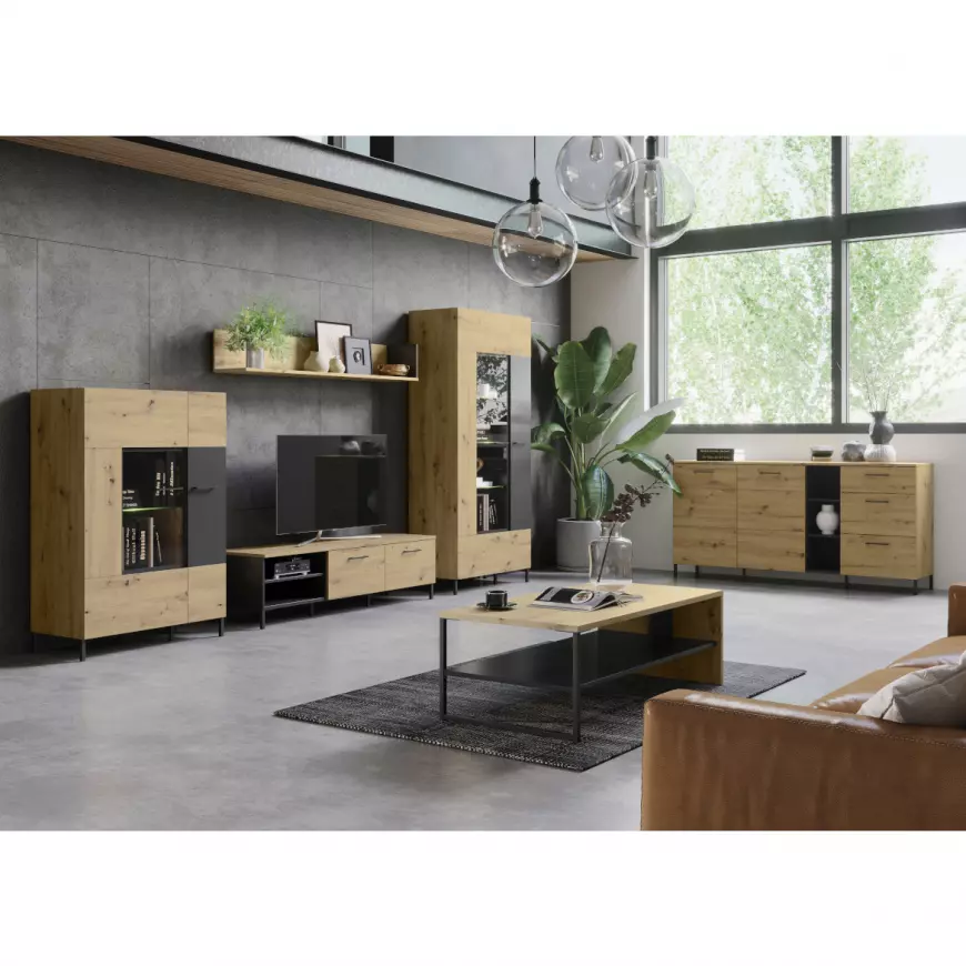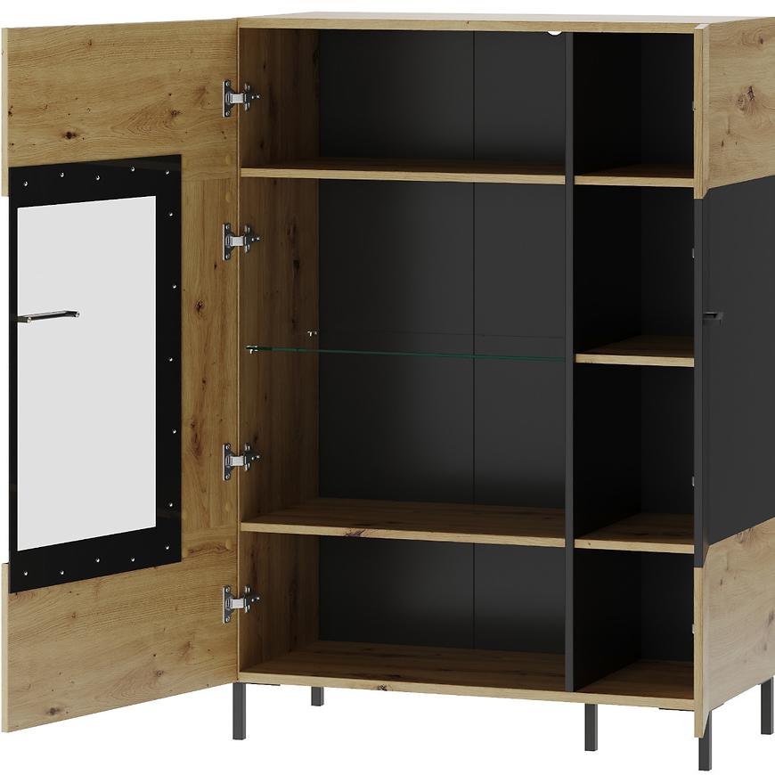 Witryna Niska Lucas 15 Dąb Artisan/Czarny Mat to połączenie funkcjonalności i estetyki w stylu skandynawskim, idealne do Twojego nowoczesnego wnętrza. Jej matowe wykończenie w kolorze dębu artisan i czarnym dodaje elegancji i klasy.