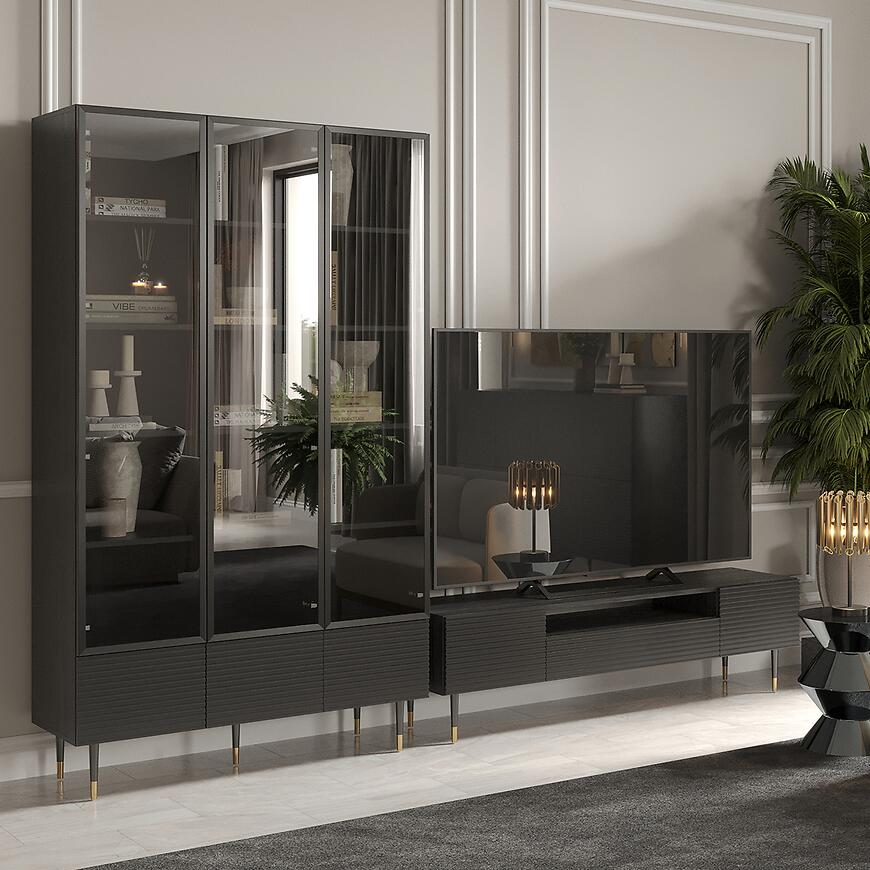 Kolorystyka witryny Imperial to głęboka czerń, zarówno na froncie, jak i korpusie, co nadaje meblowi elegancki i spójny wygląd. Matowe wykończenie minimalizuje odbicia światła i ułatwia utrzymanie mebla w czystości. Witryna Imperial idealnie komponuje się z innymi meblami z kolekcji Imperial, tworząc harmonijną przestrzeń w Twoim salonie.