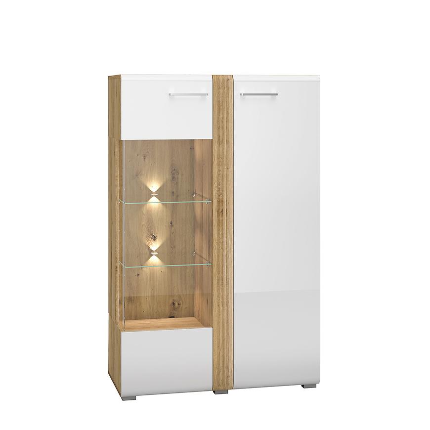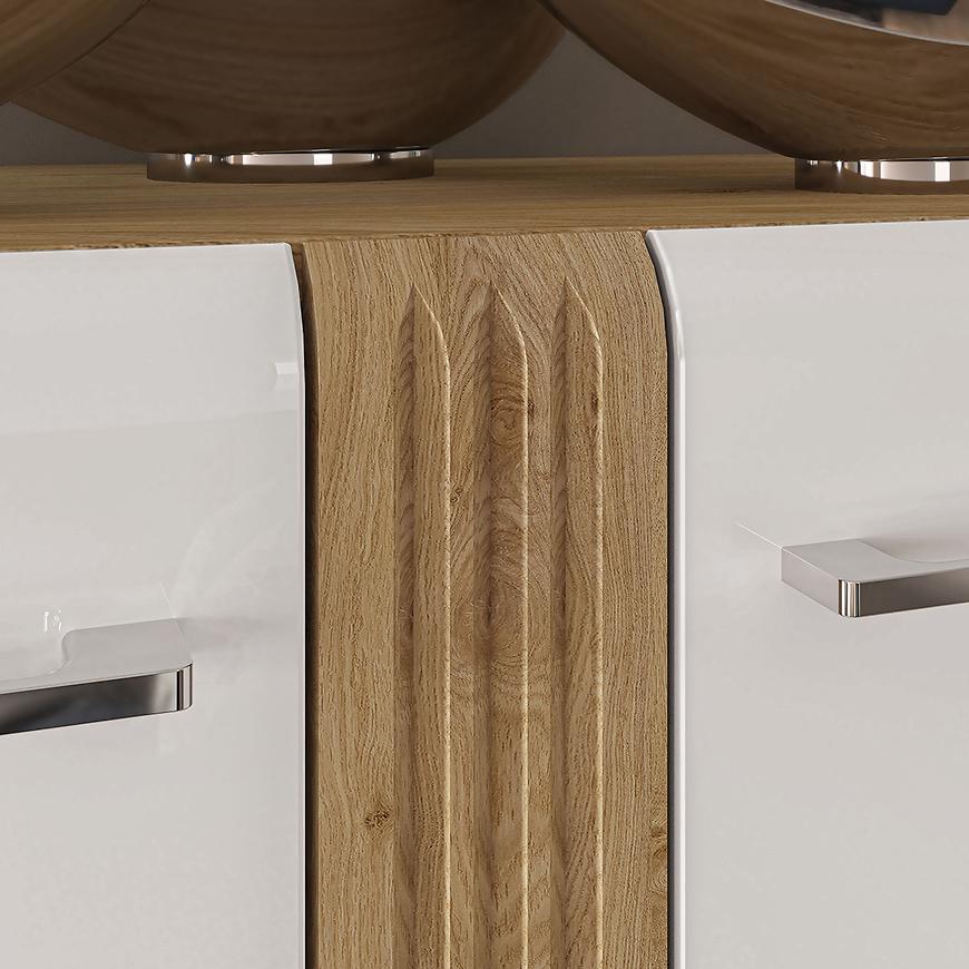 Dąb castello nadaje witrynie ciepła i naturalnego uroku. Matowe wykończenie korpusu sprawia, że mebel jest odporny na zarysowania i łatwy w utrzymaniu.