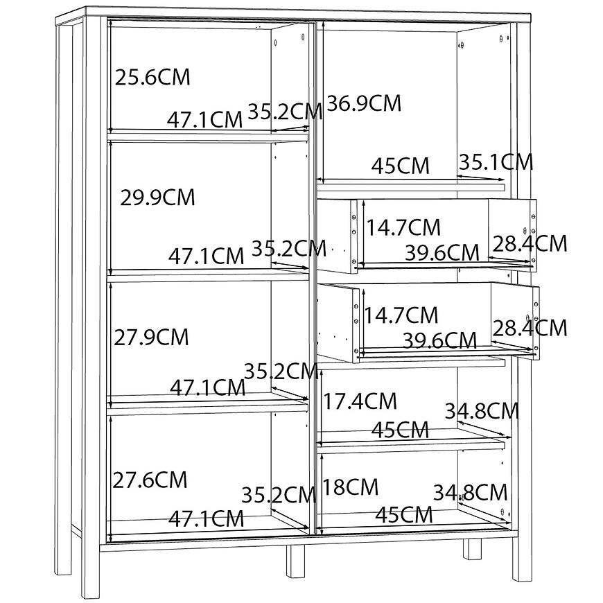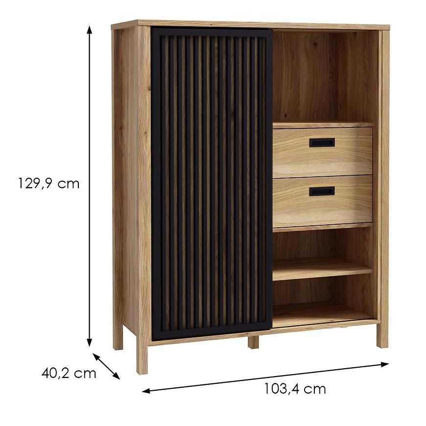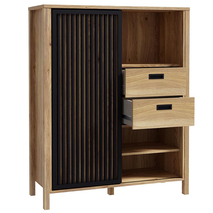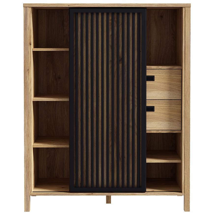 Witryna Antalaya oferuje sporo miejsca do przechowywania i eksponowania przedmiotów. Posiada 4 półki, które umożliwiają wyeksponowanie kolekcji książek, ozdób, czy innych cennych przedmiotów. Dwie szuflady i jednodrzwiowy segment dodają funkcjonalności i pozwalają na ukrycie mniej estetycznych rzeczy.