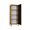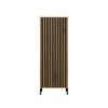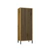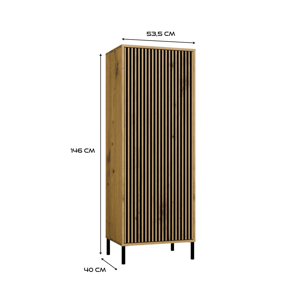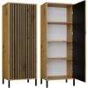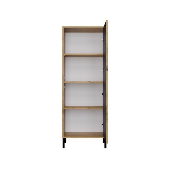 Smukła konstrukcja z długimi drzwiami nadaje meblowi lekkości, jednocześnie oferując dużą przestrzeń do przechowywania. Wnętrze witryny zostało podzielone na cztery przestrzenie dzięki trzem praktycznym półkom, które pomogą uporządkować książki, dekoracje lub inne przedmioty. Ryflowany front z płyty MDF melaminowanej, frezowanej i oklejonej folią, otwierany na klik dzięki systemowi TIP-ON, podkreśla minimalistyczny charakter mebla i zapewnia wygodne użytkowanie. Korpus z laminowanej płyty wiórowej o grubości 16 mm wyróżnia się wysoką odpornością na zarysowania i wilgoć, co gwarantuje trwałość na długie lata. Stabilność i elegancję konstrukcji podkreślają metalowe czarne nóżki o wysokości 13,5 cm, które nadają witrynie lekkości i ułatwiają utrzymanie czystości pod meblem.