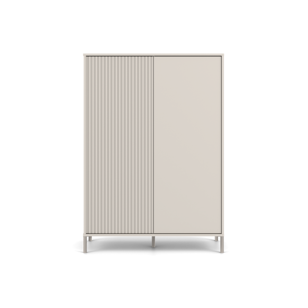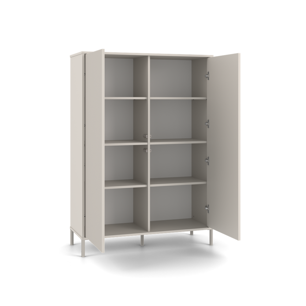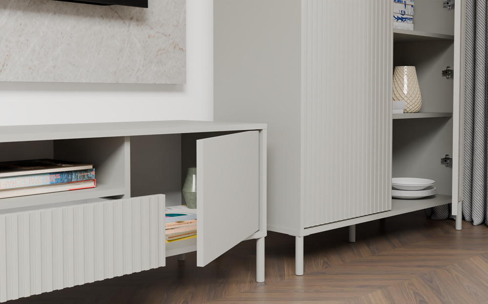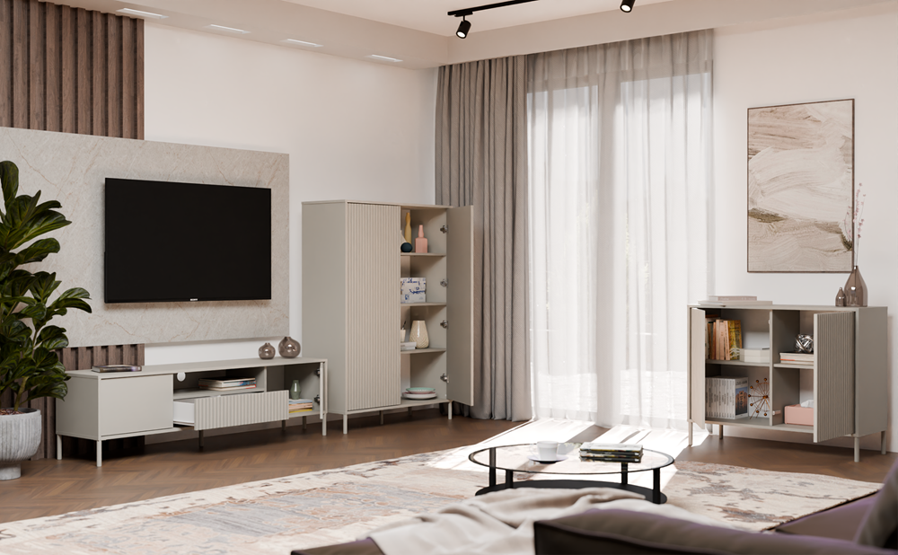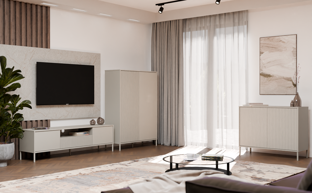 Witryna Amaro 2DD Slim to połączenie nowoczesnego designu i funkcjonalności, które doskonale wpisuje się w modne aranżacje wnętrz. Wykonana w eleganckim odcieniu kaszmiru, harmonijnie łączy klasyczny styl z nowoczesnymi akcentami. Unikalne zestawienie gładkiego frontu z ryflowanym panelem dodaje jej oryginalnego charakteru i podkreśla loftowy, industrialny oraz skandynawski styl. Ryflowane detale, inspirowane modnymi lamelami, nie tylko urozmaicają wygląd mebla, ale również dodają mu głębi i tekstury. System bezuchwytowego otwierania TIP-ON pozwala na wygodne użytkowanie, eliminując konieczność stosowania tradycyjnych uchwytów. Wystarczy lekkie naciśnięcie, aby otworzyć drzwi, co podkreśla minimalistyczny charakter witryny i zapewnia komfort codziennego użytkowania.