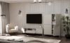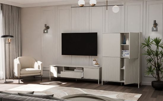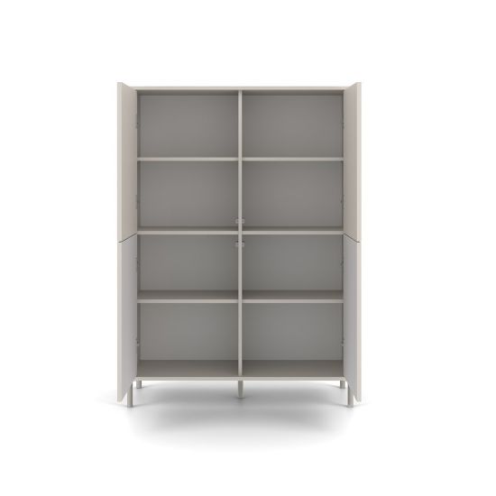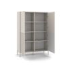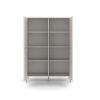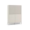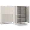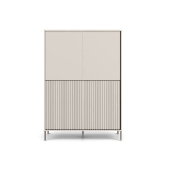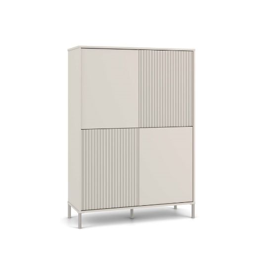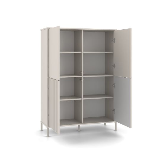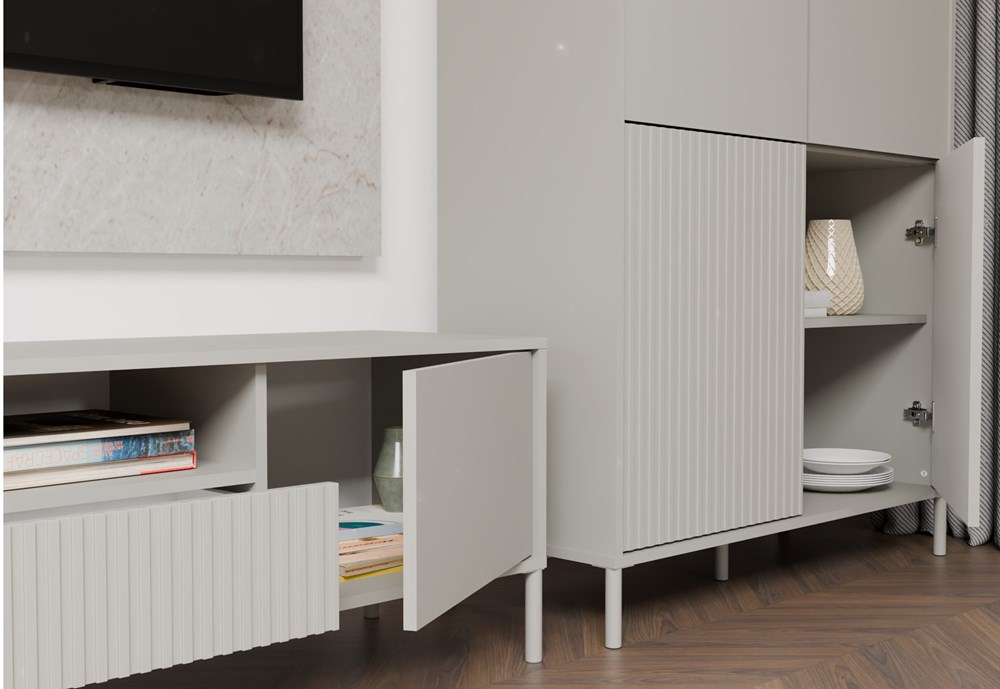 Indywidualna konfiguracja drzwi sprawia, że witryna Amaro jest jeszcze bardziej uniwersalna. Każde z czterech drzwi można dowolnie zamontować, co pozwala na wybór, które fronty będą gładkie, a które ryflowane. Dzięki temu można dostosować wygląd mebla do własnych preferencji i stylu wnętrza, tworząc niepowtarzalną aranżację dopasowaną do indywidualnych potrzeb.