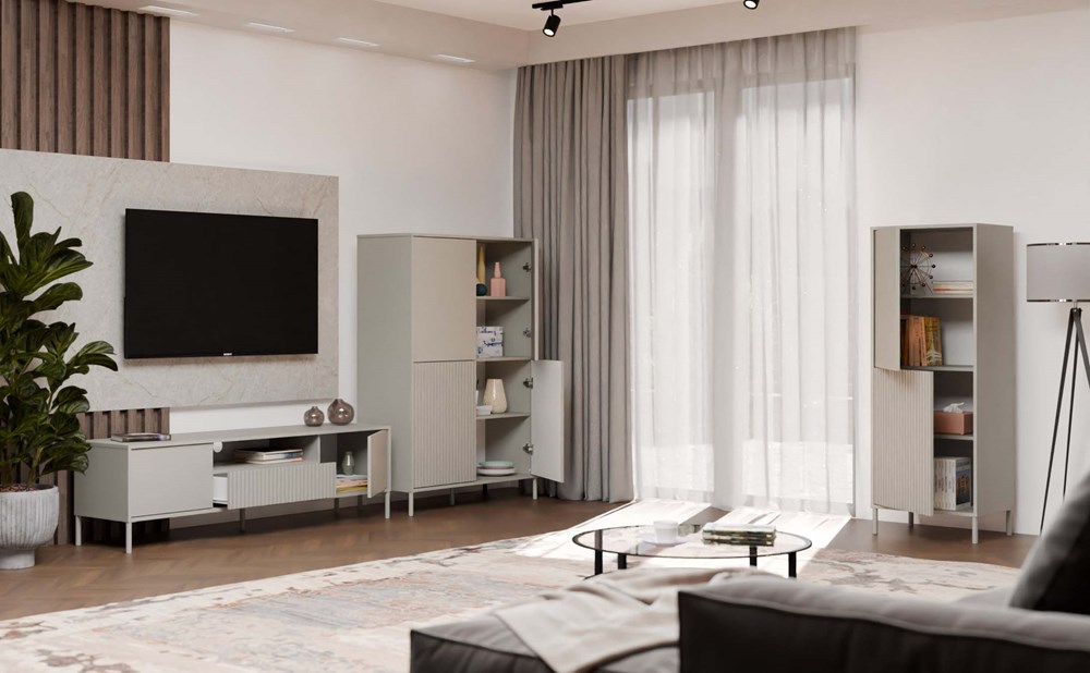 Witryna Amaro 4DK Slim to połączenie nowoczesnego designu i funkcjonalności, które doskonale wpisuje się w modne aranżacje wnętrz. Wykonana w eleganckim odcieniu kaszmiru, harmonijnie łączy klasyczny styl z nowoczesnymi akcentami. Unikalne zestawienie gładkiego frontu z ryflowanym panelem dodaje jej oryginalnego charakteru i podkreśla loftowy, industrialny oraz skandynawski styl. Ryflowane detale, inspirowane modnymi lamelami, nie tylko urozmaicają wygląd mebla, ale również dodają mu głębi i tekstury. System bezuchwytowego otwierania TIP-ON pozwala na wygodne użytkowanie, eliminując konieczność stosowania tradycyjnych uchwytów. Wystarczy lekkie naciśnięcie, aby otworzyć drzwi, co podkreśla minimalistyczny charakter witryny i zapewnia komfort codziennego użytkowania.
