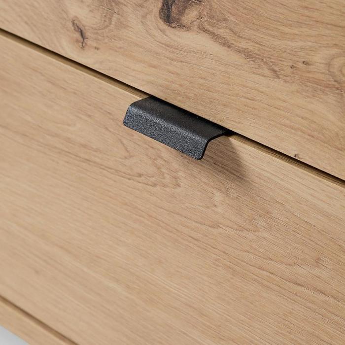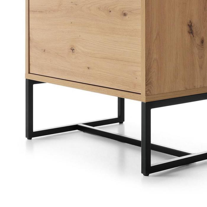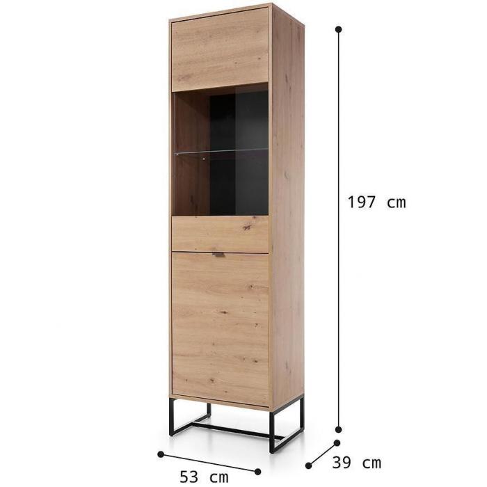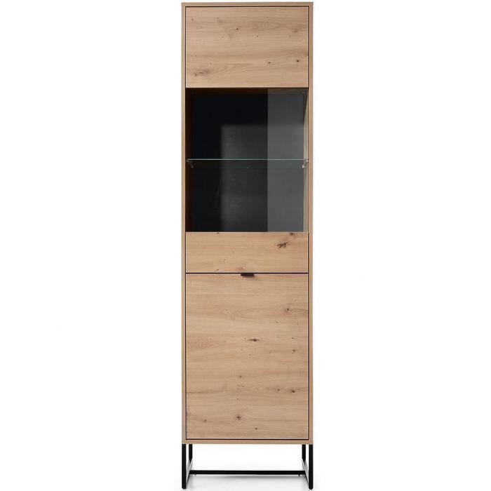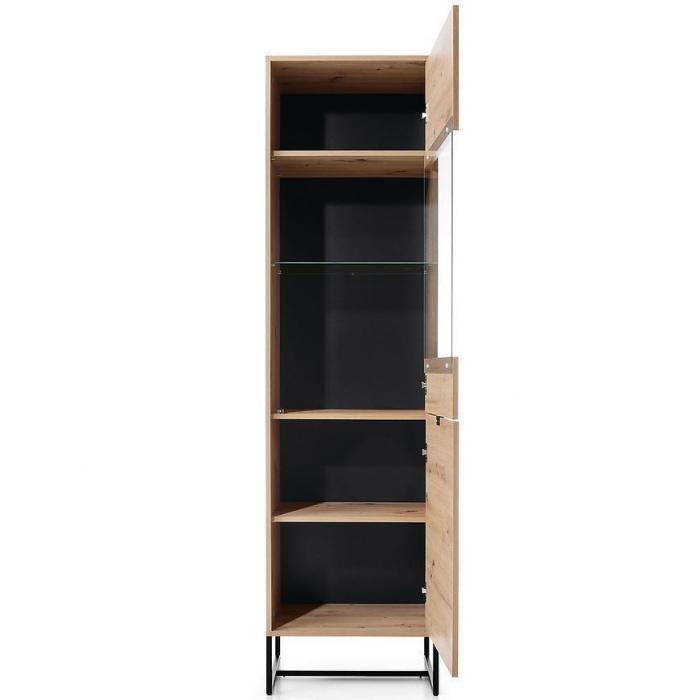 Kolekcja Abmer to meble utrzymane w stylu loftowym, modernistycznym, które świetnie sprawdzą się w nowoczesnych wnętrzach. Jasny, ciepły odcień drewna w połączeniu z czernią świetnie współgrają – drewno ociepla pomieszczenie i całą aranżację, czerń natomiast oddaje jego minimalistyczny charakter. Metalowe płozy dodatkowo stabilizują mebel. Dzięki temu, że konstrukcja jest umieszczona w ten sposób umożliwia nam odkurzenie czy umycie podłogi pod meblami. Witryna posiada dwie szafki z uchylnymi drzwiami, w której znajdują się półki. Witryna z kolekcji Amber może być świetnym uzupełnieniem aranżacji w salonie.