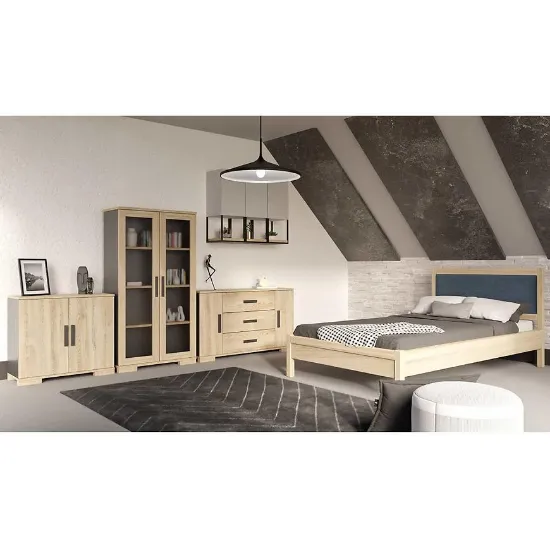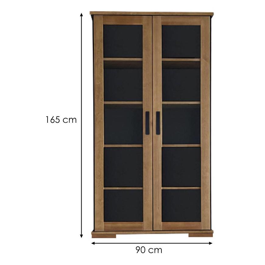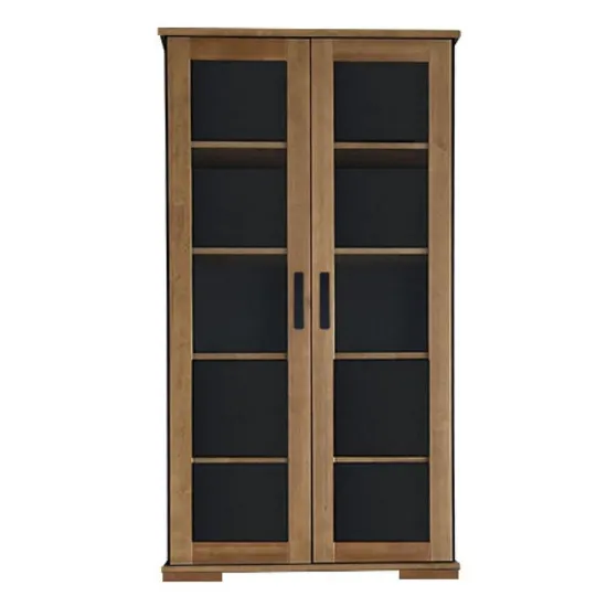 Model Ara wyróżnia się prostotą formy oraz starannym wykonaniem. Cztery półki zapewniają praktyczne miejsce do przechowywania, a dwudrzwiowe fronty chronią przed kurzem i nadają meblowi schludny wygląd. Matowe wykończenie frontów oraz korpusu sprawia, że witryna prezentuje się naturalnie i subtelnie, a kontrast jasnego drewna sosnowego i czerni dodaje meblowi wyrazistości.