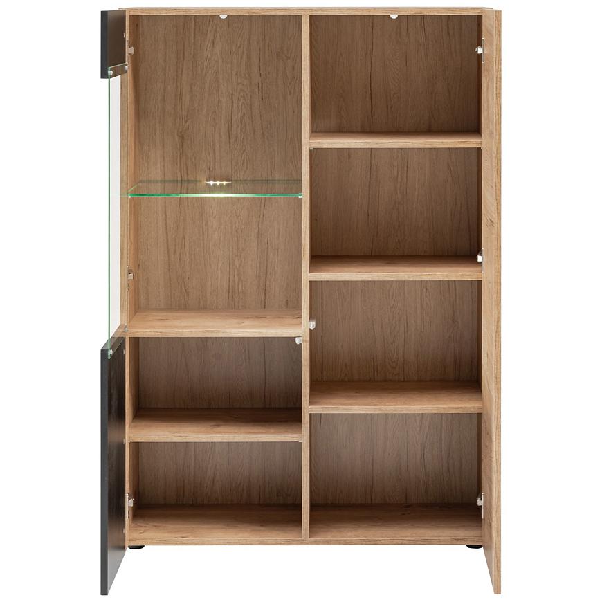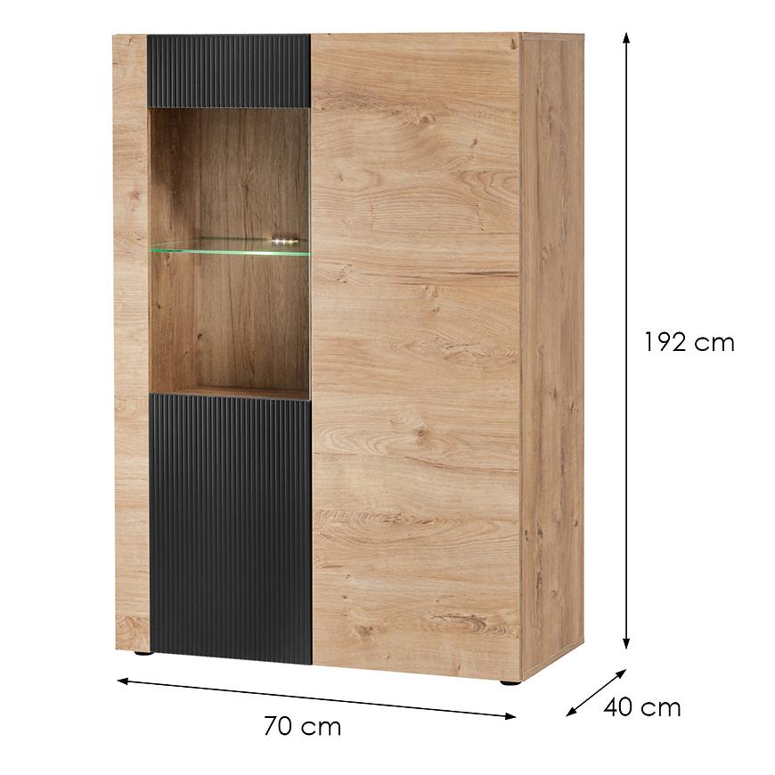 Witryna Aron to idealne rozwiązanie do nowoczesnych wnętrz, które łączy elegancki design z praktycznym wykorzystaniem przestrzeni. Mebel utrzymany jest w modnym połączeniu kolorystycznym Dąb Ribbeck i czerni, a jego matowe wykończenie podkreśla minimalistyczny charakter.