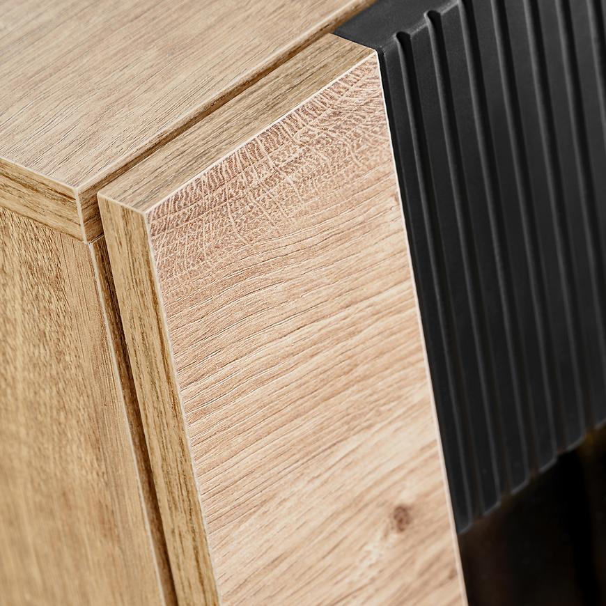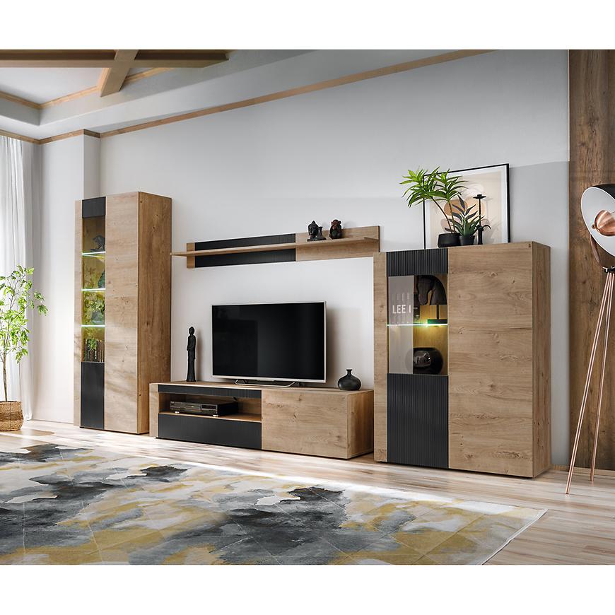 Wyjątkowe zestawienie kolorystyczne Dąb Ribbeck/Czarny wprowadza do wnętrza harmonię natury i nowoczesności. Jasne usłojenie drewna ociepla przestrzeń, a matowa czerń nadaje jej głębi i elegancji. To połączenie doskonale komponuje się z oświetleniem LED, które można dodać do niektórych elementów zestawu, tworząc wyjątkowy nastrój w salonie.