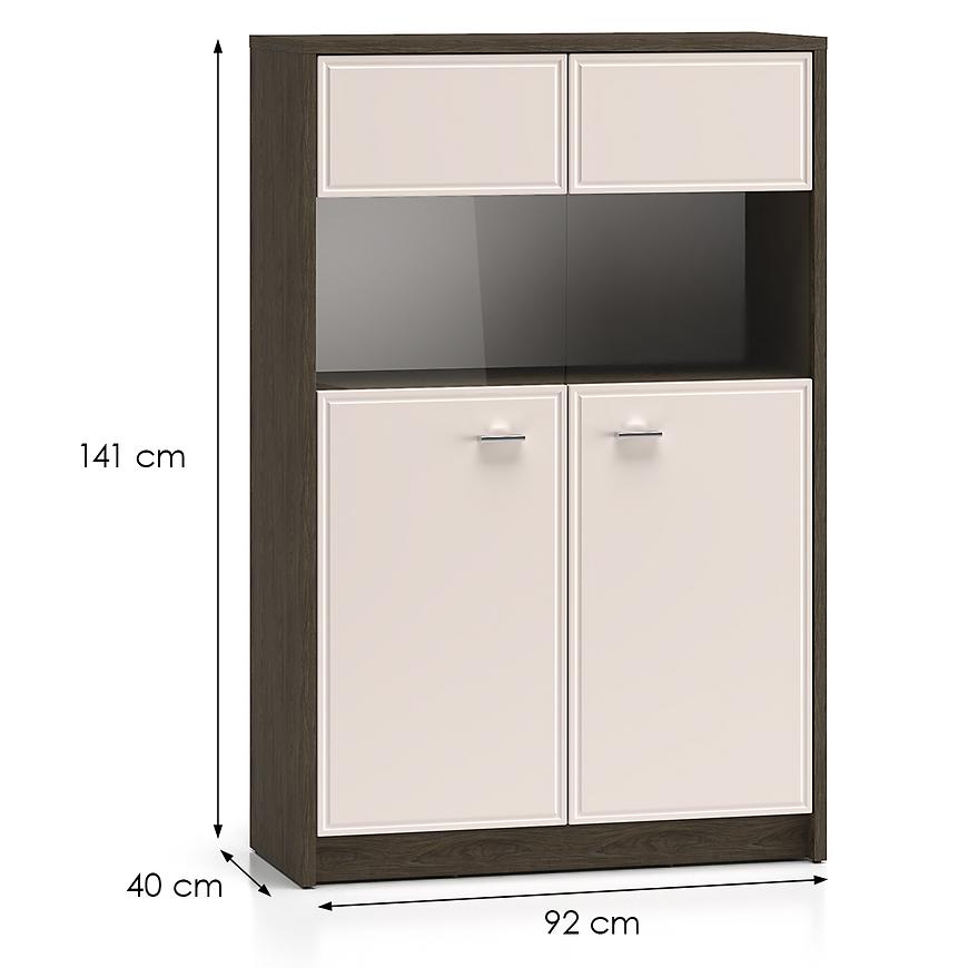 Witryna Avante 03 w kolorze Dąb Windmill Dark z frontami Cashmere to elegancki mebel o klasycznym stylu, idealny do salonu lub jadalni. Posiada dwudrzwiową konstrukcję z 4 półkami, fronty z płyty MDF w połysku oraz matowy korpus z płyty laminowanej. Wysokość 141 cm i szerokość 92 cm zapewniają funkcjonalność i estetykę. Oświetlenie dostępne za dopłatą. Witryna wymaga samodzielnego montażu.