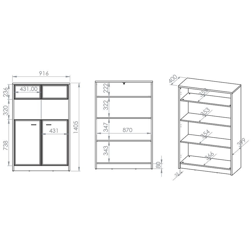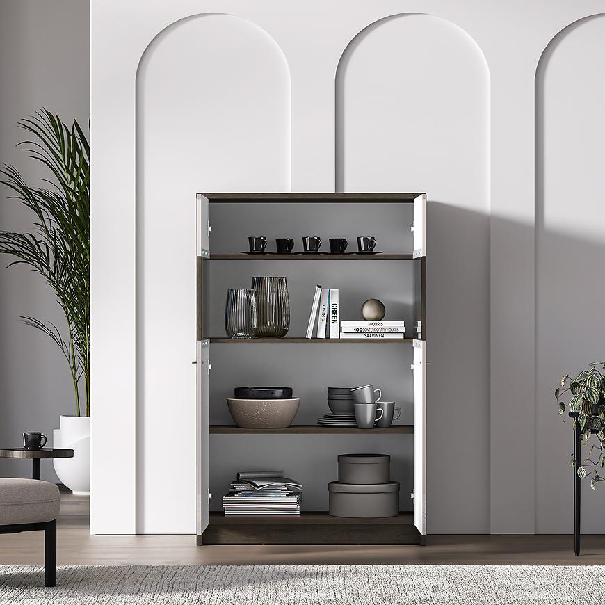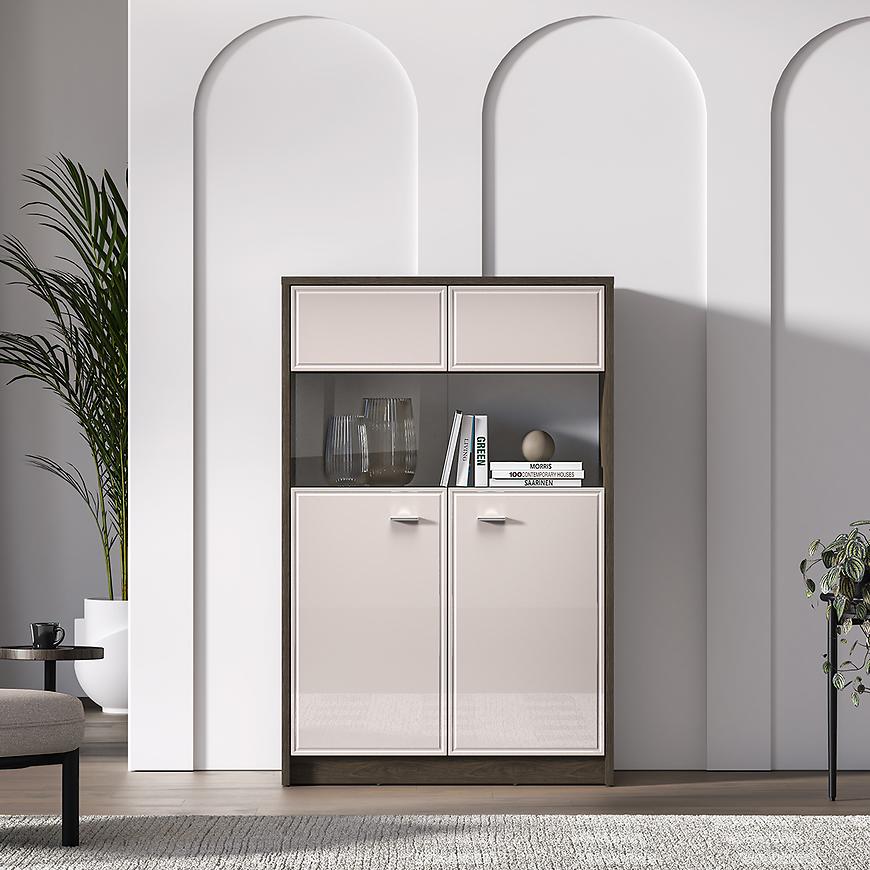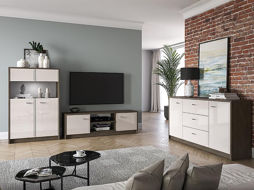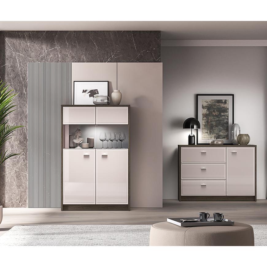 • witryna niska i witryna wysoka – z opcją podświetlenia LED za dopłatą, dzięki czemu można efektownie wyeksponować dekoracje, szkło lub zastawę,
