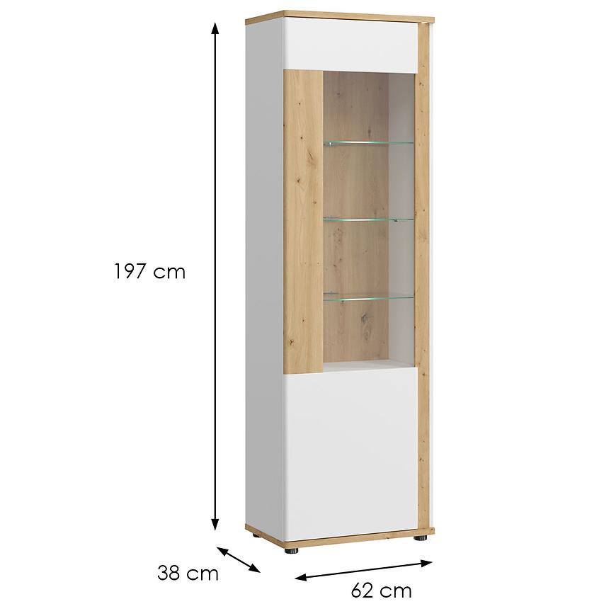 Witryna AVILA to elegancki i funkcjonalny mebel, który doskonale wpisuje się w nowoczesne aranżacje wnętrz. Połączenie bieli i dębu artisan nadaje jej wyjątkowego charakteru – kontrastowe wybarwienie łączy w sobie świeżość i przytulność, tworząc harmonijną kompozycję pasującą do salonu, jadalni czy pokoju dziennego. Fronty wykonane z płyty MDF w wysokim połysku pięknie odbijają światło, optycznie powiększając przestrzeń, natomiast korpus z płyty wiórowej laminowanej o matowym wykończeniu zapewnia trwałość i odporność na codzienne użytkowanie.