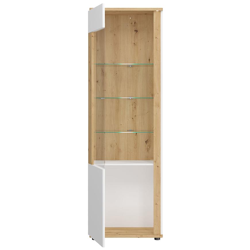 Wnętrze witryny zostało zaprojektowane z myślą o wygodzie i ekspozycji dekoracji. Cztery praktyczne półki pozwalają na uporządkowanie zastawy, książek lub ulubionych dodatków, a jednodrzwiowa konstrukcja sprawia, że mebel prezentuje się lekko i nowocześnie. Dodatkowym atutem jest wbudowane oświetlenie LED w standardzie, które subtelnie podkreśla wyeksponowane elementy, tworząc przyjemny klimat we wnętrzu.