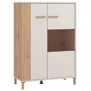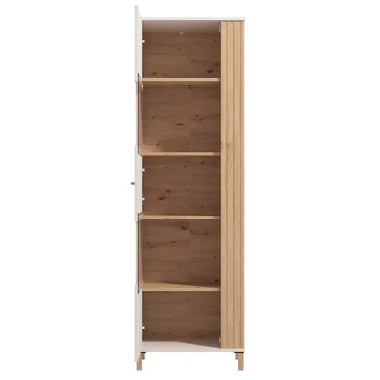 Witryna dwudrzwiowa z półkami umożliwia eleganckie przechowywanie książek, dekoracji lub zastawy stołowej.