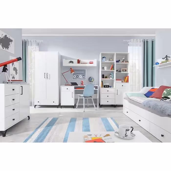 Dekor w odcieniu białym nadaje kolekcji Bergen lekkości, sprawiając, że wnętrze optycznie zaskuje więcej przestrzeni. Błyszczące wykończenie frontów i korpusów mebli podkreśla elegancki charakter kolekcji, który idealnie komponuje się zarówno ze stylem nowoczesnym, jak i klasycznym.