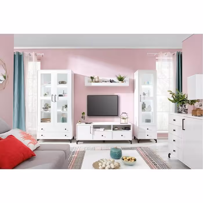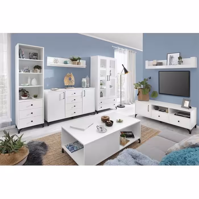 Kolekcja Bergen to wyjątkowy zestaw mebli do pokoju dziennego, który emanuje elegancją i harmonią w odcieniach bieli. Wykonane z trwałej płyty wiórowej laminowanej, meble tej kolekcji nie tylko zachwycają swoim estetycznym wyglądem, ale także są praktyczne i funkcjonalne.