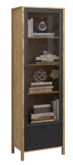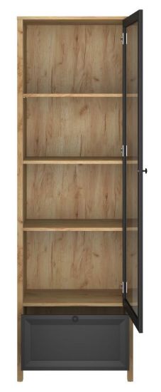Witryna Brent to stylowy i funkcjonalny mebel, który doskonale sprawdzi się w salonie, jadalni lub gabinecie. Eleganckie połączenie dębu craft złotego z czarnymi frontami nadaje jej nowoczesny, loftowy charakter. Wyposażona w 3 drzwi, 1 szufladę i 4 półki, oferuje przestrzeń do przechowywania oraz ekspozycji dekoracji czy zastawy stołowej. Wykonana z płyty MDF i laminowanej płyty meblowej, zapewnia trwałość i solidność. Wymaga samodzielnego montażu. Idealna do wnętrz w industrialnym i nowoczesnym stylu.
