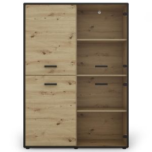 Kolekcja mebli do pokoju dziennego Capannoli to ukłon w stronę nowoczesności, funkcjonalności i estetyki, zapewniający wnętrzu niezwykłe walory wizualne oraz praktyczne zastosowanie. Wykonane z trwałej płyty wiórowej laminowanej, meble z tej kolekcji reprezentują doskonałą jakość i trwałość, gwarantując długotrwałą satysfakcję użytkowania. Charakterystycznym elementem kolekcji Capannoli jest połączenie dekoru dąb artisan z akcentami w kolorze czarnym, które nadają wnętrzu cgarakteru. Matowe wykończenie frontów i korpusów mebli podkreśla nowoczesny styl oraz pozwala na stworzenie spokojnej, harmonijnej atmosfery w pomieszczeniu.