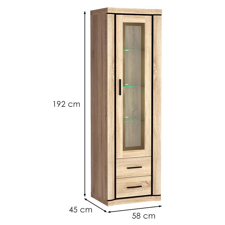 Witryna Dallas D16 w kolorze dąb sonoma idealnie sprawdzi się w salonie, pokoju dziennym czy w innym, dowolnym pomieszczeniu. Posiada dużo miejsca do przechowywania. Dodatkowe czarne elementy nadadzą nowoczesny styl wnętrzu. Całość została wykonana z płyty wiórowej laminowanej.