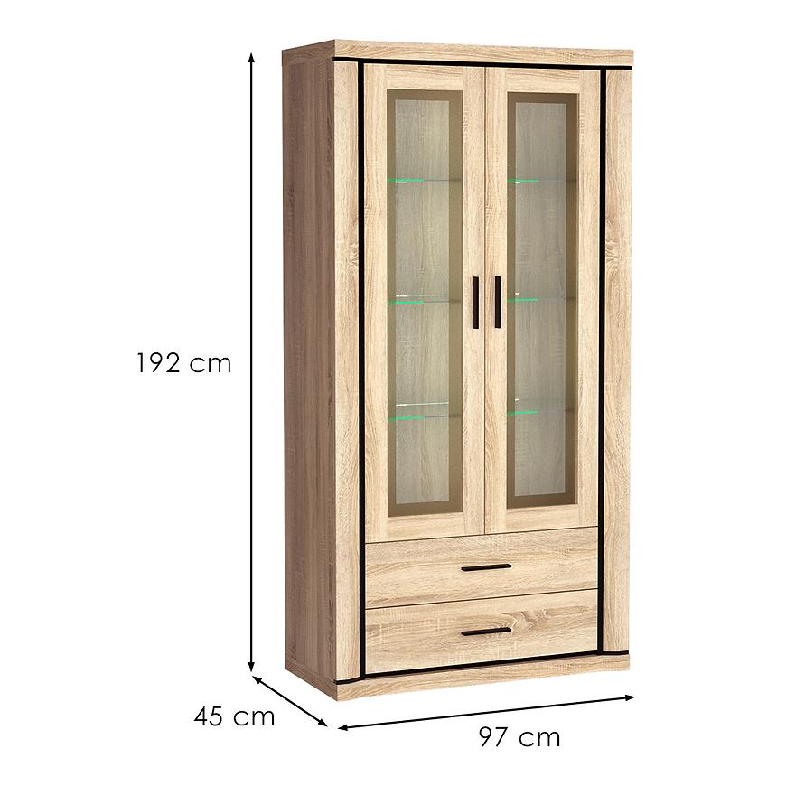 Witryna Dallas D17 w kolorze dąb sonoma idealnie sprawdzi się w salonie, pokoju dziennym czy w innym, dowolnym pomieszczeniu. Posiada dużo miejsca do przechowywania. Dodatkowe czarne elementy nadadzą nowoczesny styl wnętrzu. Całość została wykonana z płyty wiórowej laminowanej.