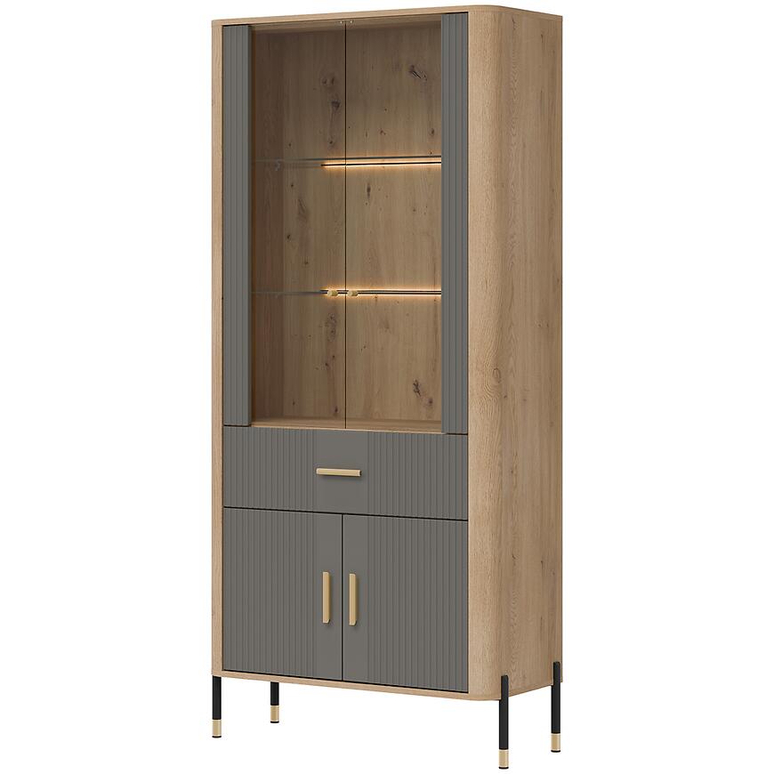Szare fronty w matowym wykończeniu harmonizują z korpusem w kolorze dąb cremona, nadając meblowi nowoczesny i elegancki charakter. Dzięki temu witryna Dante DT14 łatwo komponuje się z innymi meblami z kolekcji DANTE oraz dodatkami w neutralnych i naturalnych tonacjach.