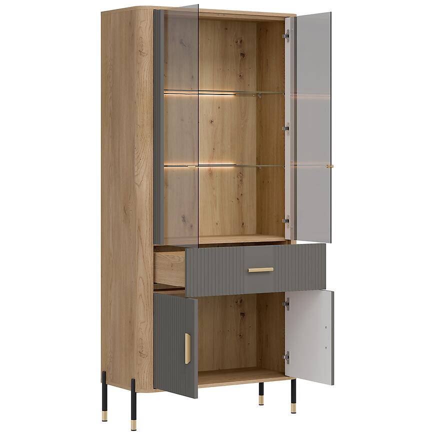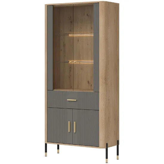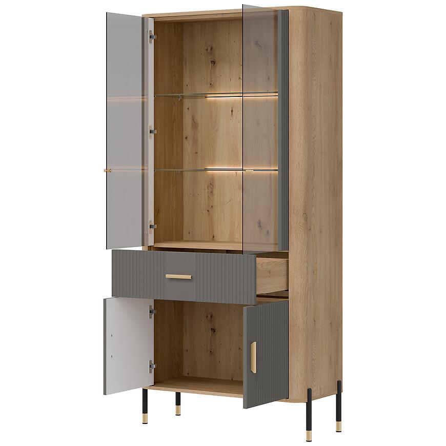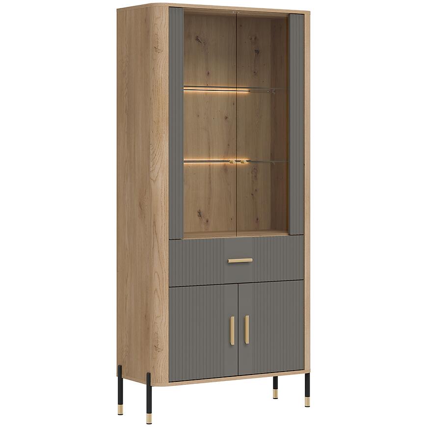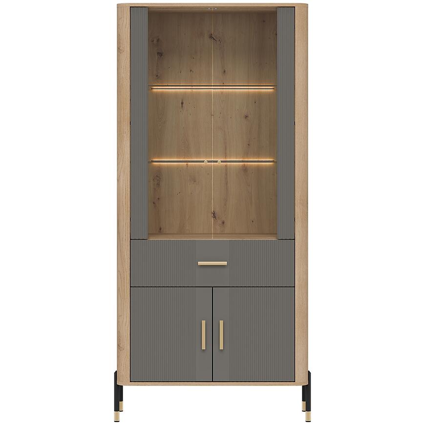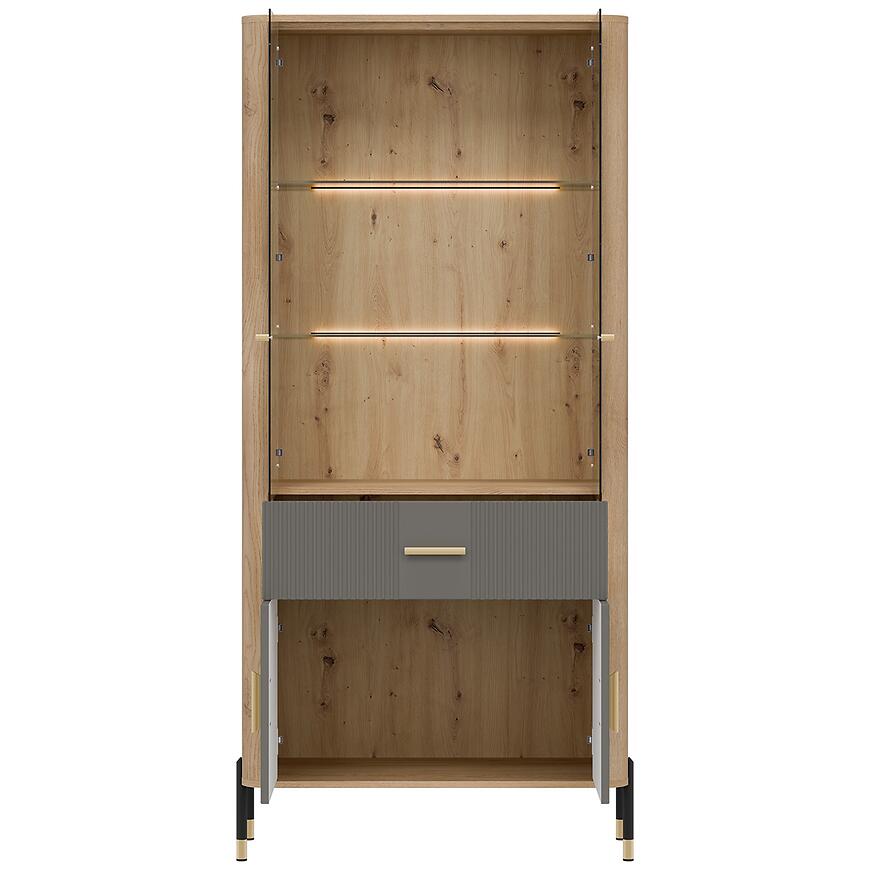 Witryna Dante DT14 dąb cremona szary z LED to nowoczesny i funkcjonalny mebel, który łączy elegancki design z praktycznym układem przechowywania i eksponowania przedmiotów. Doskonale sprawdzi się w salonie, jadalni lub gabinecie, tworząc uporządkowaną i stylową przestrzeń.