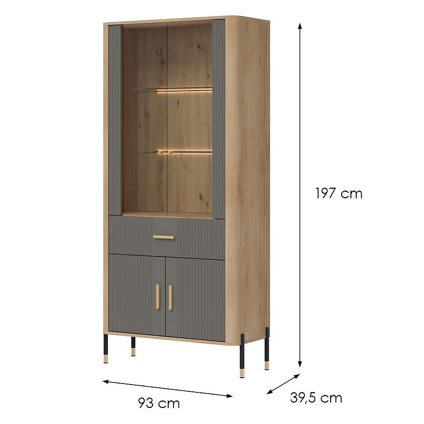 Wysokość 197 cm, szerokość 93 cm i głębokość 39,5 cm zapewniają przestronną powierzchnię do przechowywania i prezentowania przedmiotów. Kilkudrzwiowa konstrukcja ułatwia dostęp do wnętrza, a szklane elementy subtelnie eksponują wybrane dekoracje, nadając wnętrzu nowoczesny charakter.