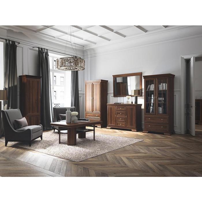 Witryna Kora w kolorze samoa king została wykonana z płyty wiórowej laminowanej. Model nawiązuje do eleganckiego, klasycznego stylu, co podkreślają efektowne żłobienia. Dostępna, stonowana kolorystyka uwydatnia elegancką, nienaganną estetyką wykonania. Witryna jest dwudrzwiowa z dwoma szufladami i czterema półkami.