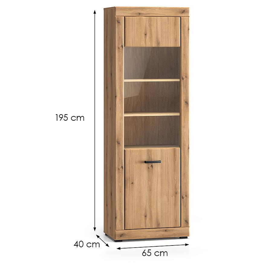 Witryna ma wysokość 195 cm, szerokość 65 cm i głębokość 40 cm, co zapewnia dużą pojemność przy stosunkowo kompaktowych wymiarach. Pięć półek oraz dwudrzwiowa konstrukcja pozwalają maksymalnie wykorzystać przestrzeń użytkową i łatwo utrzymać porządek.