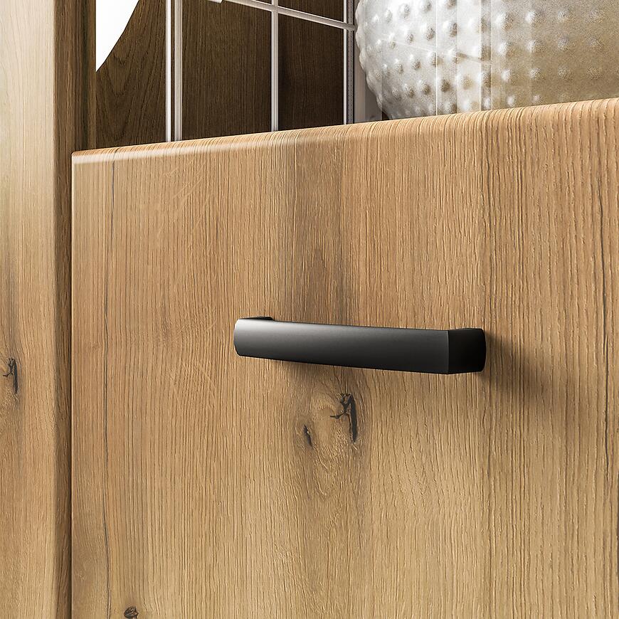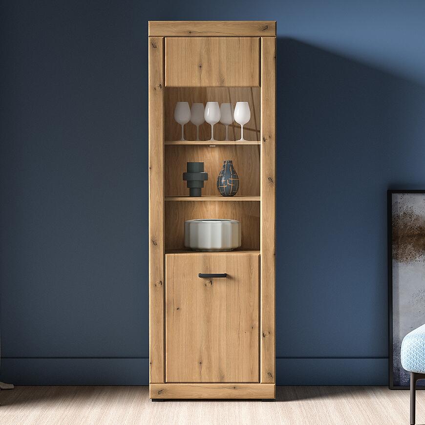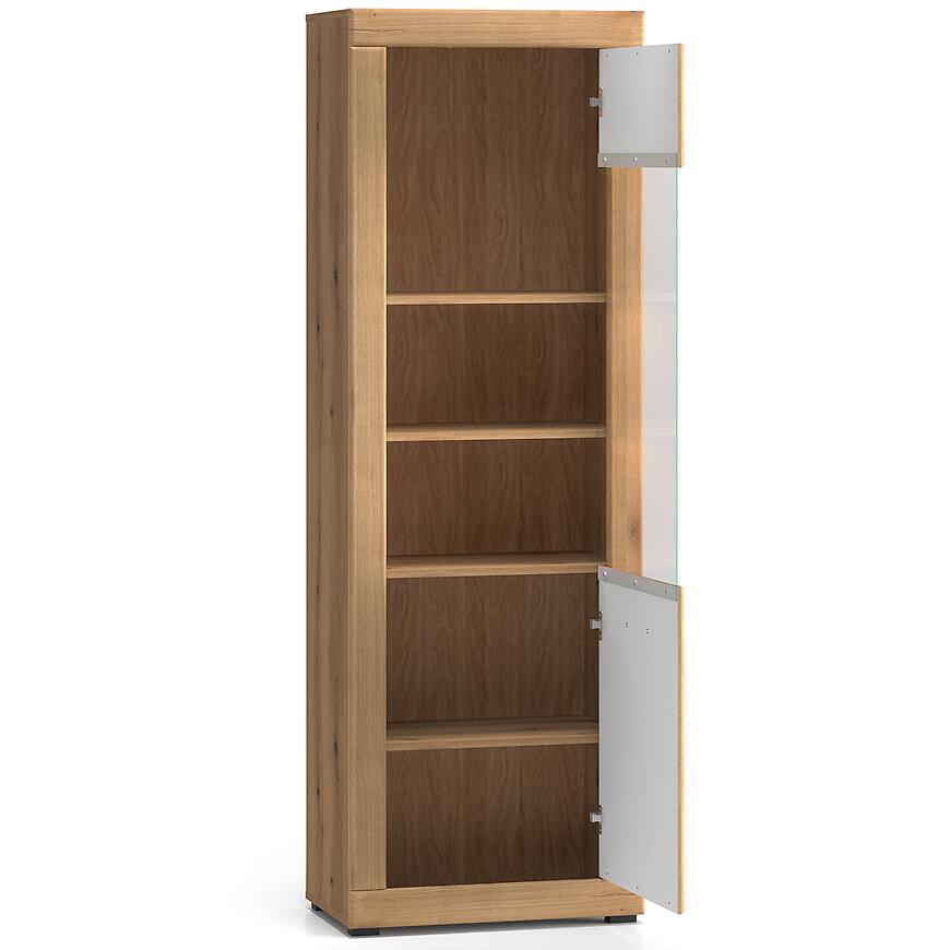 Witryna Dora 02 Dąb Evoke łączy klasyczny design z nowoczesnymi elementami, takimi jak LED w standardzie. Matowe wykończenie i jasne wybarwienie sprawiają, że mebel wprowadza do wnętrza elegancję i przytulny charakter.