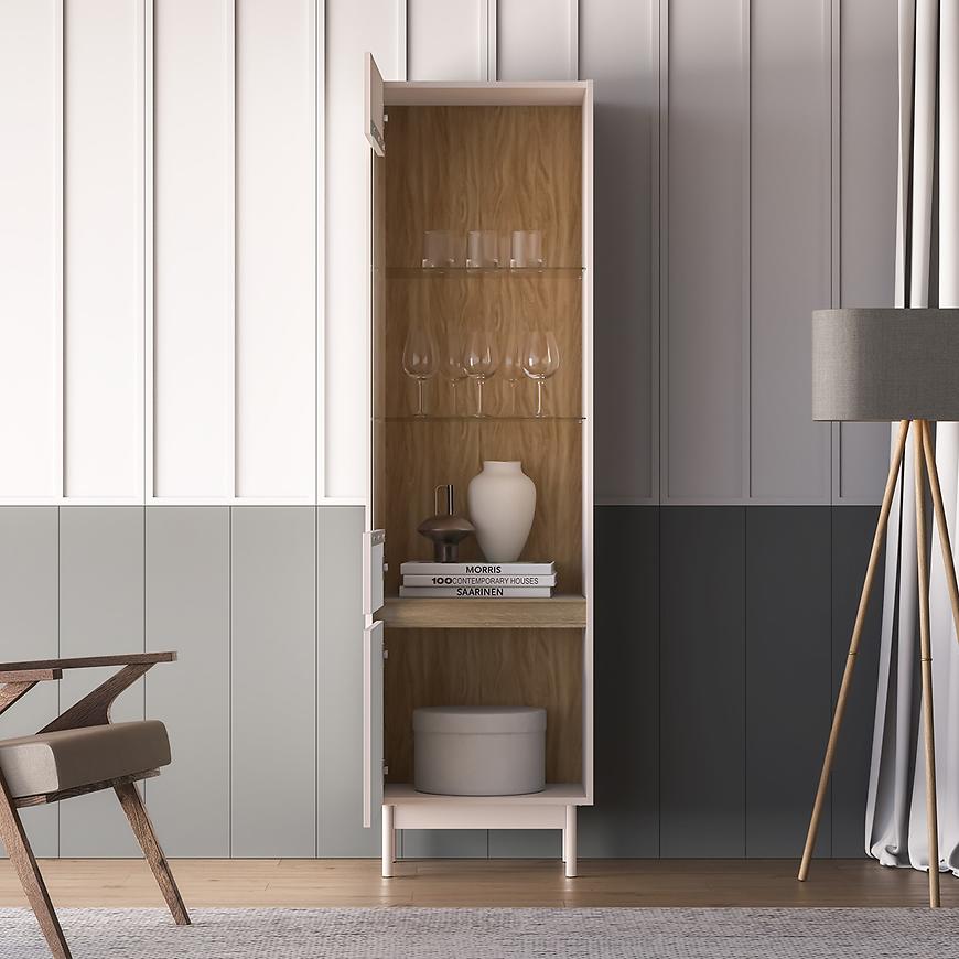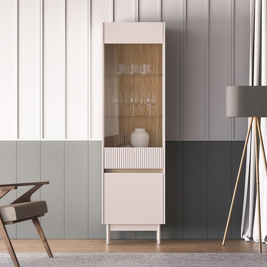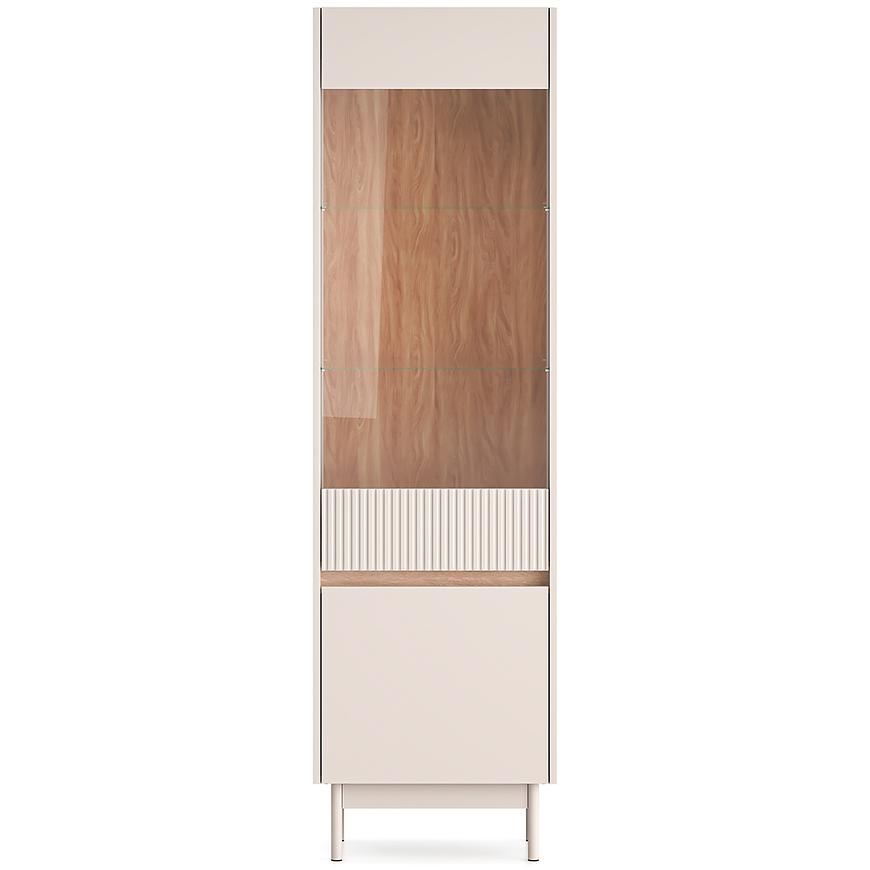Witryna Dunea 02 Cashmere to nowoczesny mebel o eleganckim, beżowym wybarwieniu. Dwudrzwiowa konstrukcja mieści 4 praktyczne półki, a fronty z matowego MDF w kolorze cashmere doskonale komponują się z korpusem w dekorze cashmere/dąb Cremona Torro. Wysokość 193 cm i szerokość 55 cm sprawiają, że witryna idealnie nadaje się do salonu lub jadalni. Oświetlenie dostępne za dopłatą. Mebel wymaga samodzielnego montażu.