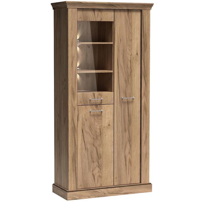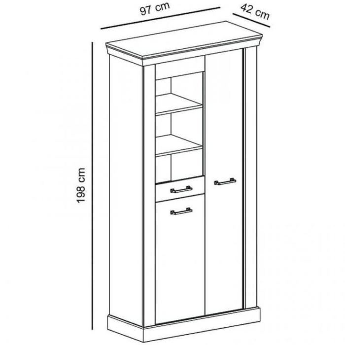 Witryna posiada trzy szafki. Dwie szafki są z pełnymi frontami, natomiast jedna posiada szkło hartowane. W szafkach znajduje się siedem półek, co zapewni odpowiednią ilość miejsca na przechowywane przedmioty. Dodatkowym atutem jest zastosowany cichy domyk.