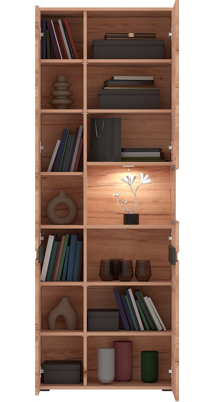 Dodatkowo, witryna Alana ALAV06R oferuje możliwość zamówienia oświetlenia LED, które dodaje meblowi wyjątkowego charakteru. Oświetlenie LED nie tylko podkreśla elegancję witryny, ale również eksponuje umieszczone na półkach przedmioty, nadając im nowego blasku. Wieczorami delikatne światło LED tworzy w pomieszczeniu przytulną atmosferę, sprzyjającą relaksowi i odpoczynkowi. To detal, który sprawia, że witryna Alana ALAV06R staje się nie tylko funkcjonalnym meblem, ale również ważnym elementem dekoracyjnym wnętrza.