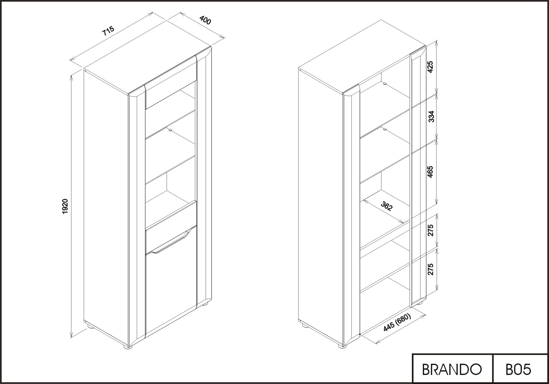Witryna L/P Brando B05 doskonale uzupełni aranżację salonu czy jadalni, a stabilna konstrukcja to atuty, które wyróżniają witrynę na tle innych. Za przeszkloną częścią drzwi znajdziesz dwie podświetlane półki szklane, które możesz przeznaczyć na część ekspozycyjną. W dolnej części witryny pochowasz na półkach wszystkie przedmioty, których nie chcesz eksponować. Witryna jest uniwersalna, można zdecydować, czy drzwi maja otwierać się na prawą, czy na lewą stronę. Nowoczesny wygląd witryny zapewniają frezowane fronty, które pełnią rolę uchwytów do otwierania. Uniwersalny wygląd mebla komponuje się z innymi kolorami, co pozwoli na nieograniczone możliwości aranżacyjne. Witryna idealnie sprawdzi się w kompozycji z innymi bryłami z serii BRANDO lub jako pojedynczy mebel, który można dopasować do własnej aranżacji pomieszczenia.