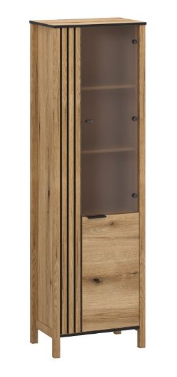Witryna została wykonana z wysokiej jakości płyty meblowej laminowanej o eleganckim kolorze dąb evok. Jej matowe wykończenie nadaje całości wyjątkowego charakteru, tworząc subtelne połączenie nowoczesności z klasycznym wzornictwem. Fronty mebla zdobią delikatne ryfle, dodając mu niepowtarzalnego uroku.