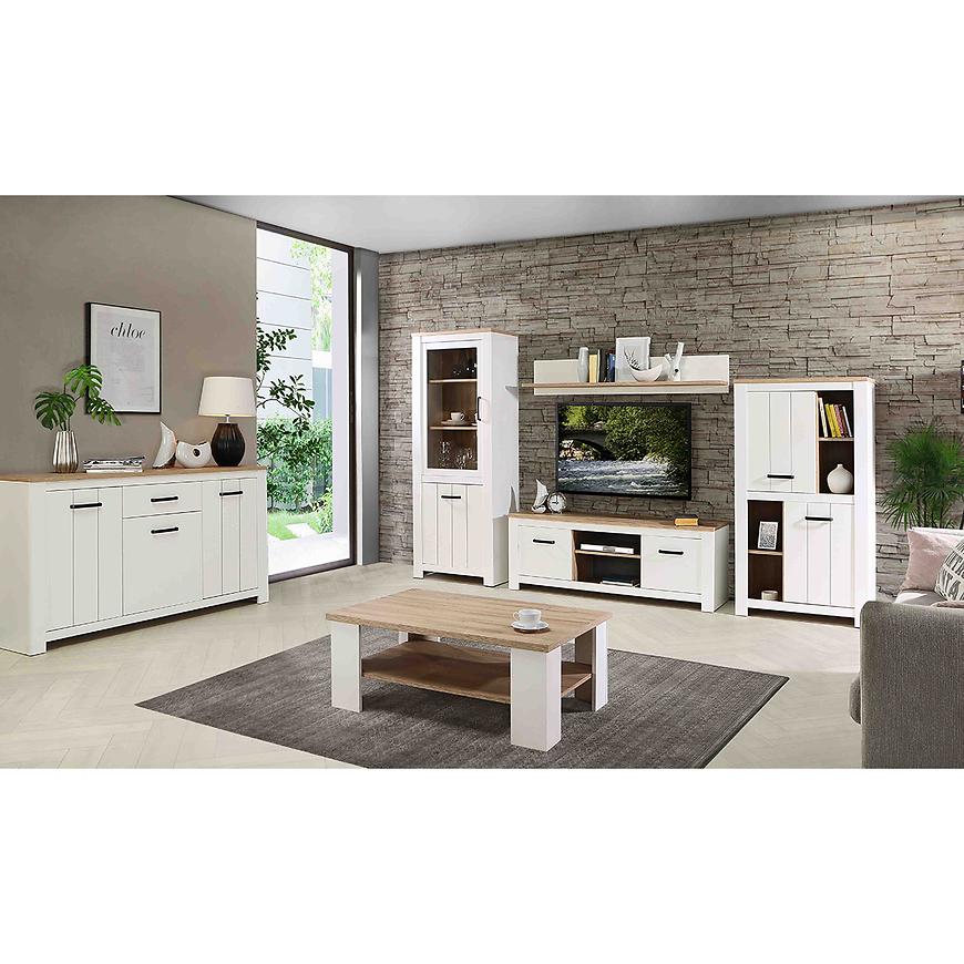 Kolorystyka i wybarwienie: Witryna Elara wyróżnia się jasnym drewnopodobnym wybarwieniem, które dodaje wnętrzu ciepłego i naturalnego charakteru. Fronty w kolorze białym matowym harmonizują z korpusem w kolorze białym matowym z elementami dębu bianco, tworząc elegancki i nowoczesny wygląd.